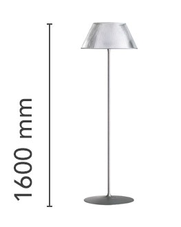 Floor lamp providing diffused light. Acid-etched pressed borosilicate glass internal diffuser. Pressed clear glass shade. Gray painted steel stem and die-cast aluminum base and yoke. Injection-molded transparent polycarbonate diffuser support. On the cable there is the electronic dimmer which allows the regulation of light brightness.