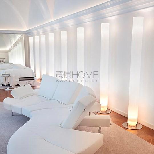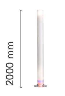 Floor lamp providing indirect and diffused light. Silver powder-coated steel base. Opaline extruded polymethylmethacrylate (PMMA) diffuser column. Functions ON/OFF of two placed luminous sources at the extremities of the diffuser of the apparatus, happen by means of interrupting double quantity to pedal mounted on the cable feeding electrical worker.