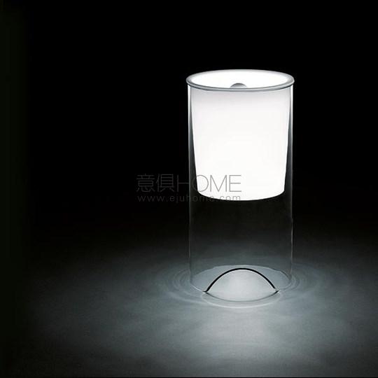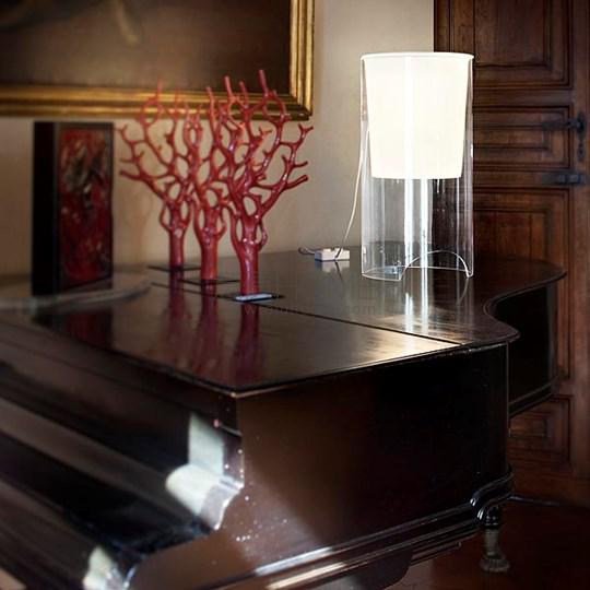 Table lamp providing diffused light. Clear glass cylindrical lamp body. White opaline glass diffuser and reflector.