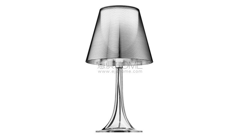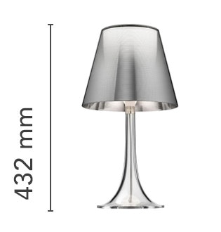 Table lamp providing diffused light. Fully transparent, injection-molded PMMA polymethylmethacrylate frame; opaline, injection-molded polycarbonate internal diffuser and injectionmolded transparent or colored polycarbonate external diffuser completely finished with high-vacuum aluminization process.