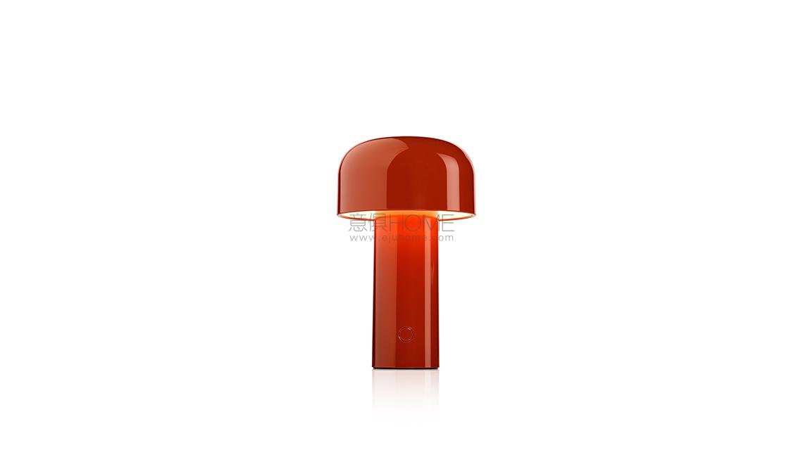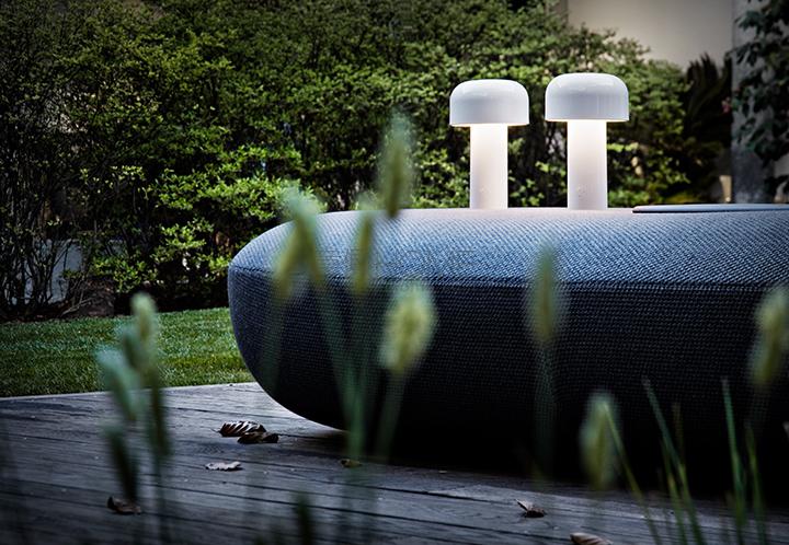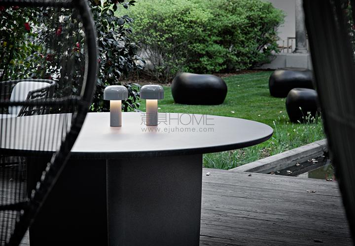 Rechargeable direct light table lighting device. Base and dome in coloured PC. Diffuser in Opaline injection moulded photo-engraved PC. 24-hours' autonomy, charging via Micro-USB-C. Push-button switch positioned on the base provides the 4-step dimmer function. Battery status indicator positioned under the base. USB-C charging cable included, useful length 120cm. USB battery charging on plug with interchangeable plugs