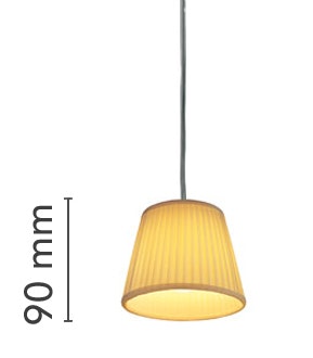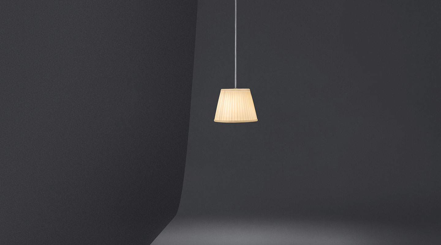 Suspension lamp providing diffused light. Acid-etched pressed borosilicate glass internal diffuser. Plissé cloth shade. Gray painted die-cast aluminum diffuser support.