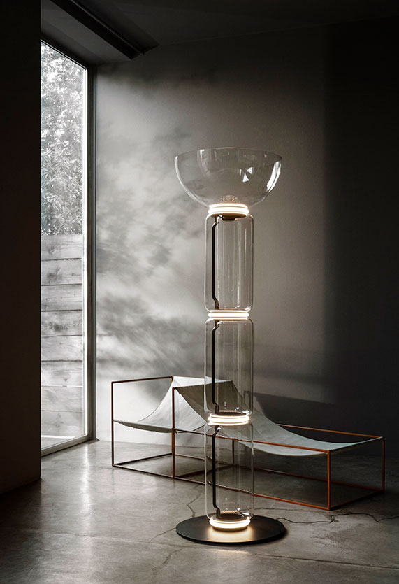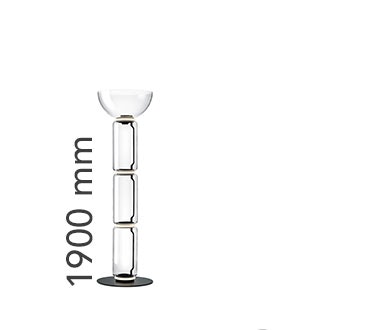 Standing lamps consisting of interconnecting glass modules reaching a height of 2,17 metres (85.43"). Cylindrical and semi-spherical transparent blown glass structure, die cast aluminium base and rings, hydroformed steel internal lateral arms and injection moulded optical opal silicone outer ring diffusers. The power supply cable is 2 metres (78.74") long, with a pedal operated panel used as a dimmer to adjust the light intensity by 10% to 100% in either direction. Wall mounted power supply unit with interchangeable plugs.