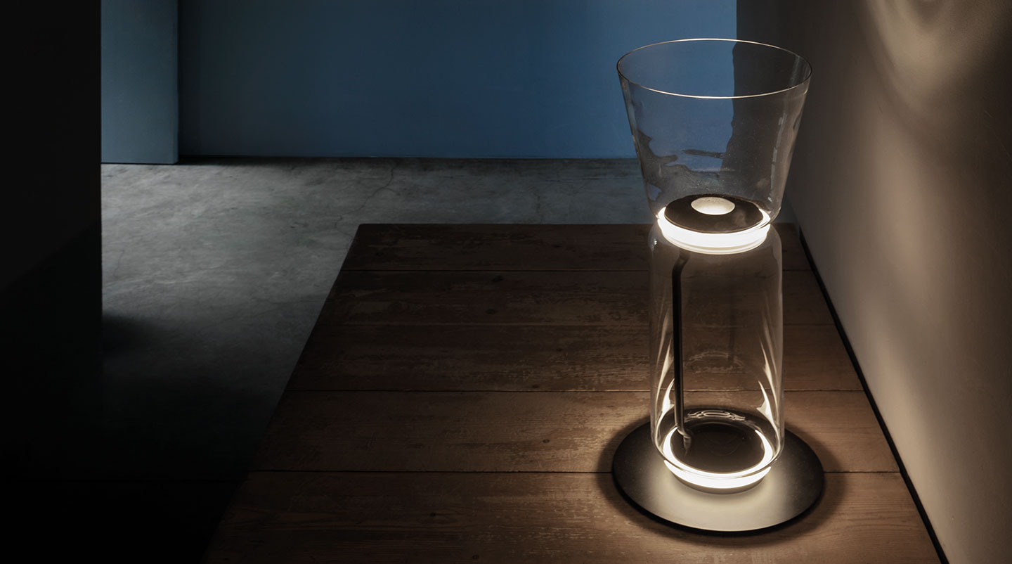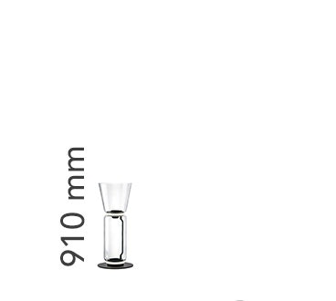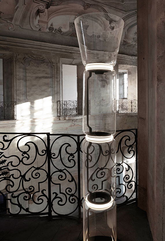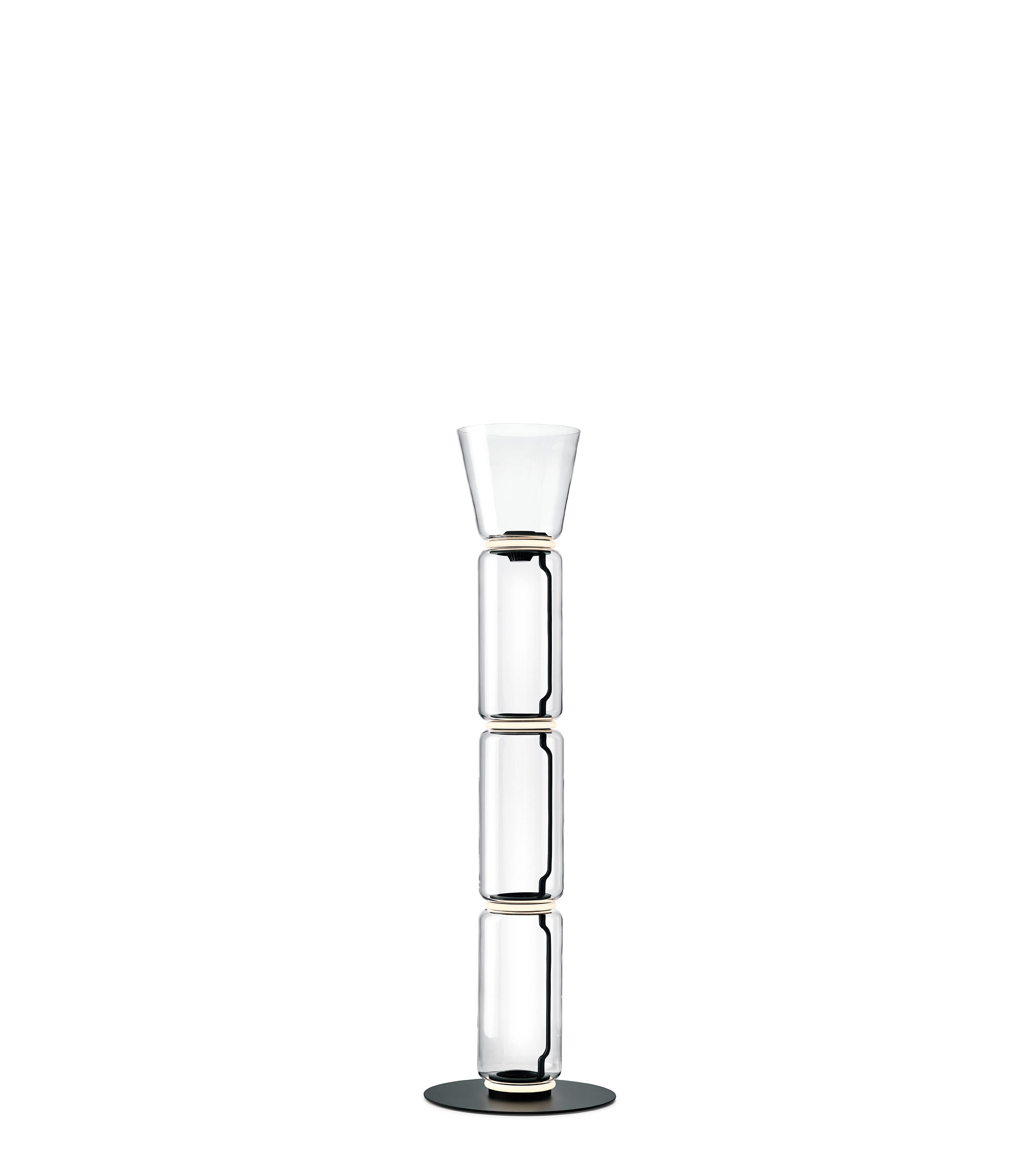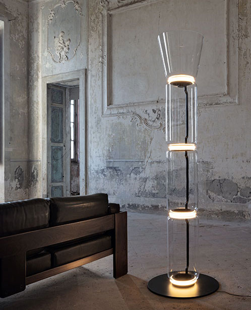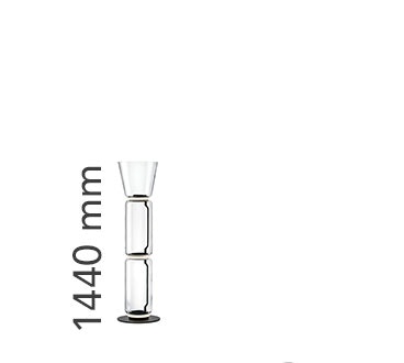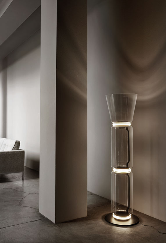 Standing lamps consisting of interconnecting glass modules reaching a height of 2,17 metres (85.43"). Cylindrical and semi-spherical transparent blown glass structure, die cast aluminium base and rings, hydroformed steel internal lateral arms and injection moulded optical opal silicone outer ring diffusers. The power supply cable is 2 metres (78.74") long, with a pedal operated panel used as a dimmer to adjust the light intensity by 10% to 100% in either direction. Wall mounted power supply unit with interchangeable plugs.