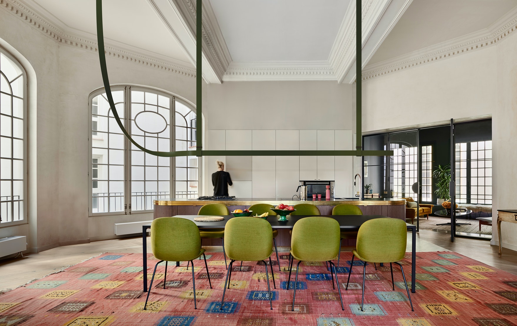 Technical lighting line covered in a fine leather cover sewn to measure that integrates all elements of the composition. The innovative connection system has been developed to achieve a sinuous line without apparent interruptions.