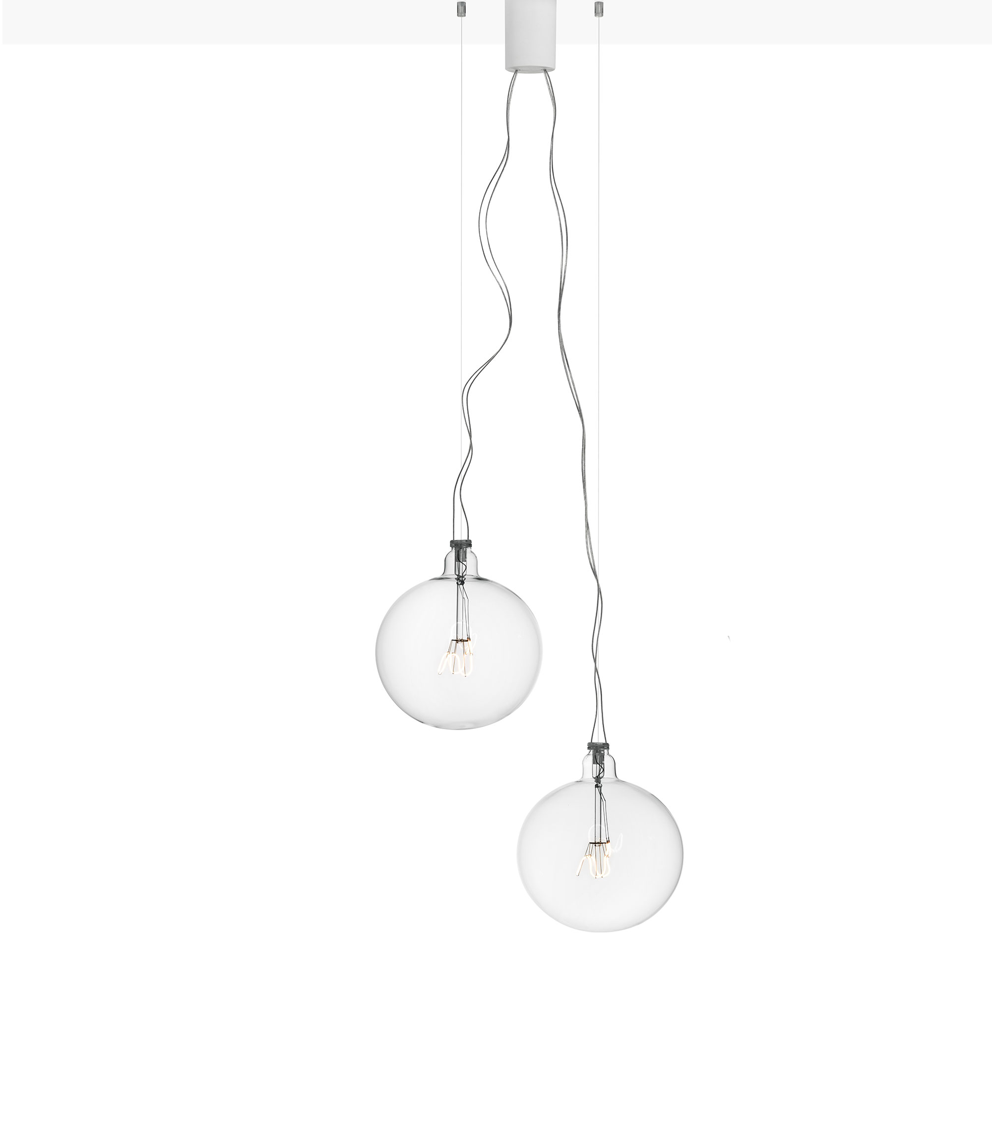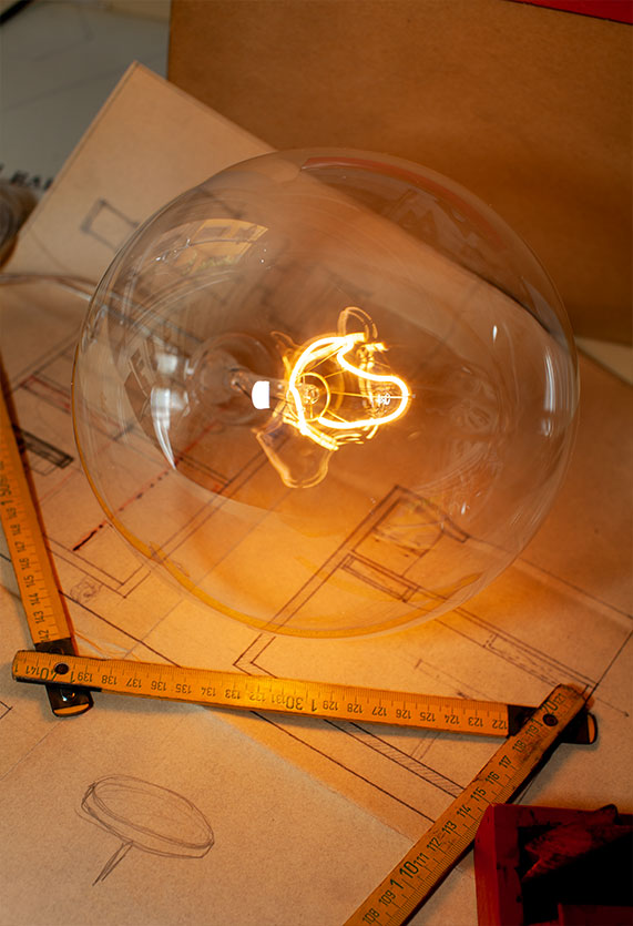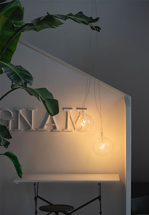 A bulb-shaped lighting unit made of blown borosilicate glass, with good shock resistance properties and excellent transparency, due to the reduced thickness of the material. The led filament is held in position by a molybdenum structure incorporated in a thin tube, also made of borosilicate, which is used in turn to extract the air and therefore prevent any internal condensation build-up. The filaments which convey the power are housed in a dedicated cable gland designed to satisfy the safety regulations and standards. The light source consists of a 225 mm long flexible micro-led filament, using customised electronics which can handle a light flow of 210 - 450 lumen, using the most common Triac dimmers. Luminous flux is in proportion to the voltage for each lighting fixture. The light temperature of 2200°K was selected to replicate that of the traditional incandescent lamp. The same applies to the high CRI (95), which guarantees a high quality standard of chromatic performance.