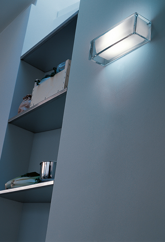 Wall lamp providing direct/indirect and partially diffused light. Lamp body in transparent glass. Internal diffuser in opal glass. The wall mount is a white powder coated, aluminum alloy die-casting including both the wall fitting system and the electrical equipment.