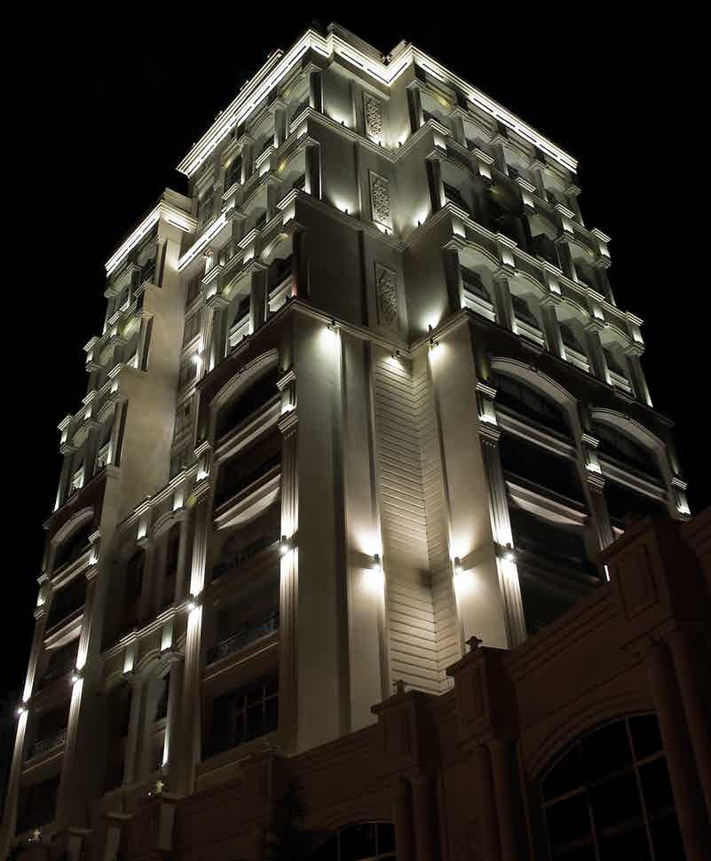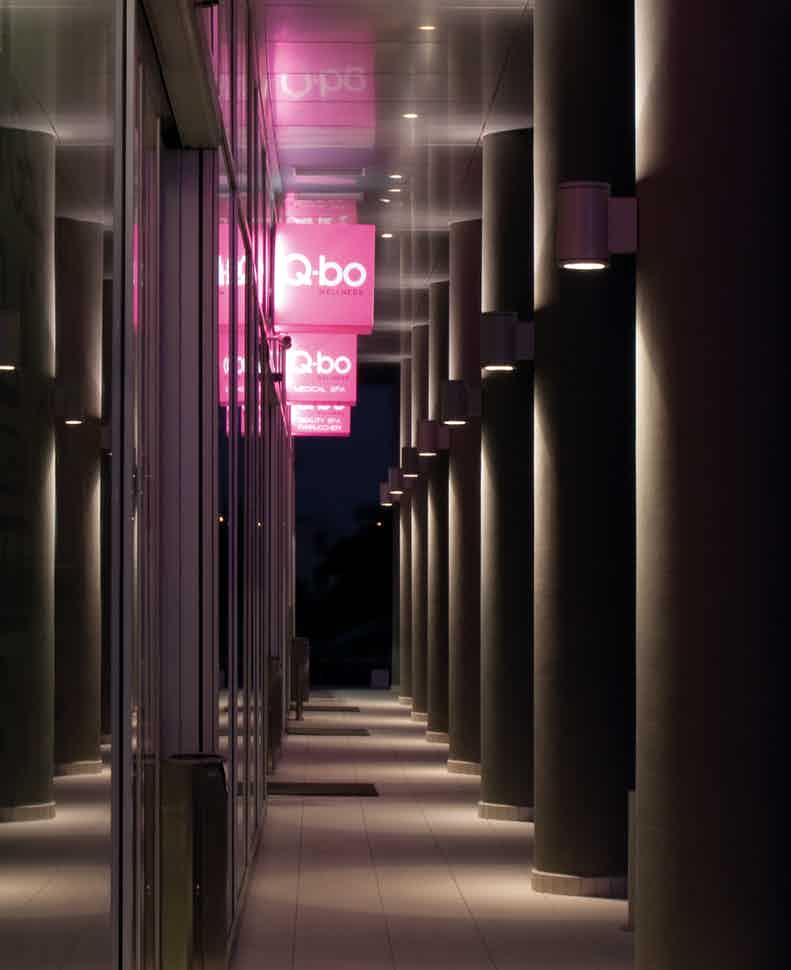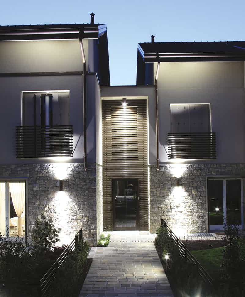 Complete range of cylindrical luminaires, for wall installation, available in both mono-directional and bi-directional versions, perfect for creating contrasting accent lighting on facades and perimeters.