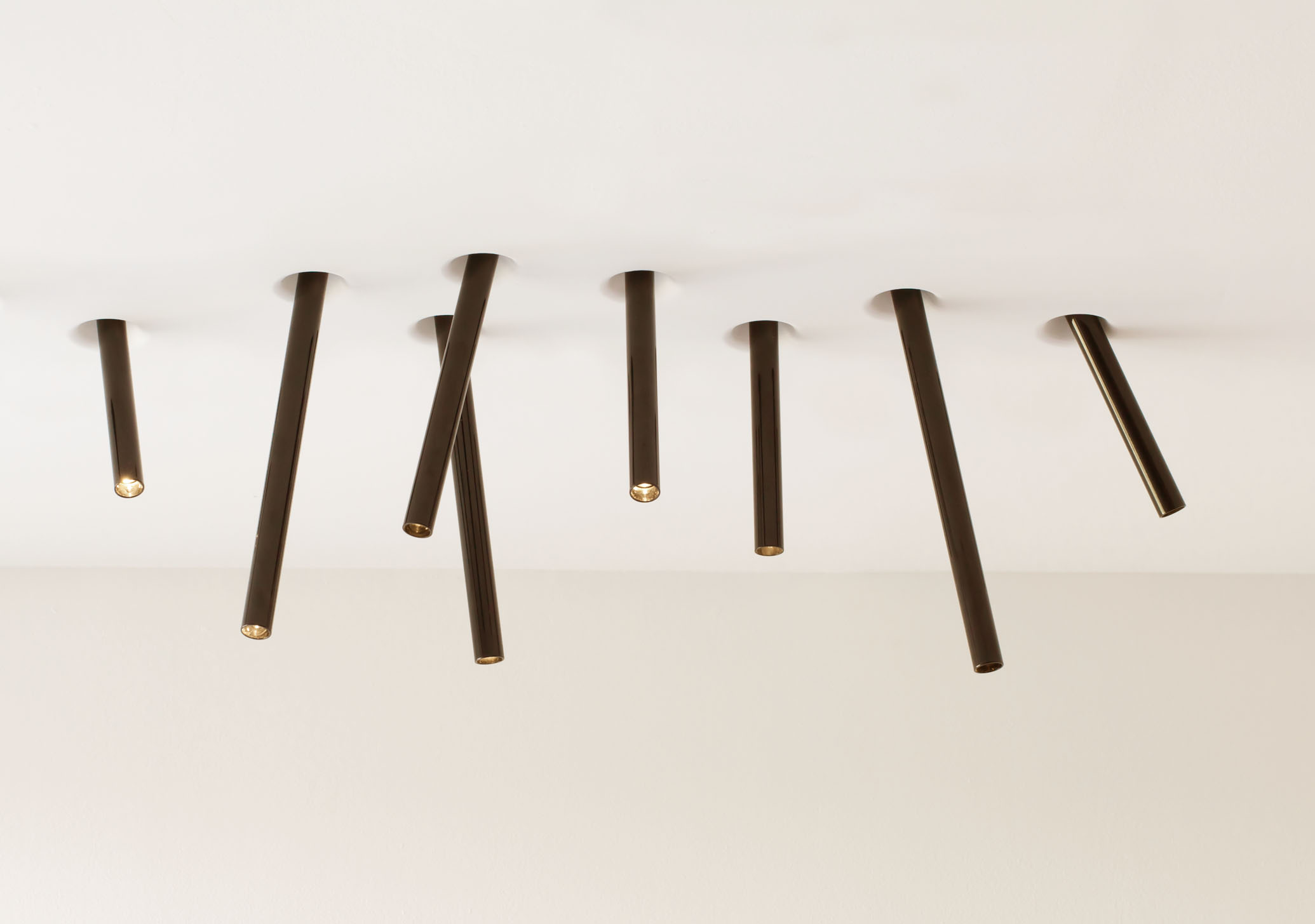 Luminaire inspired by “bunches of reeds” hovering over the water surface. With a high power LED, the tube can be tilted and inserted or removed from the ceiling to direct the beam of light and create the desired artistic composition.