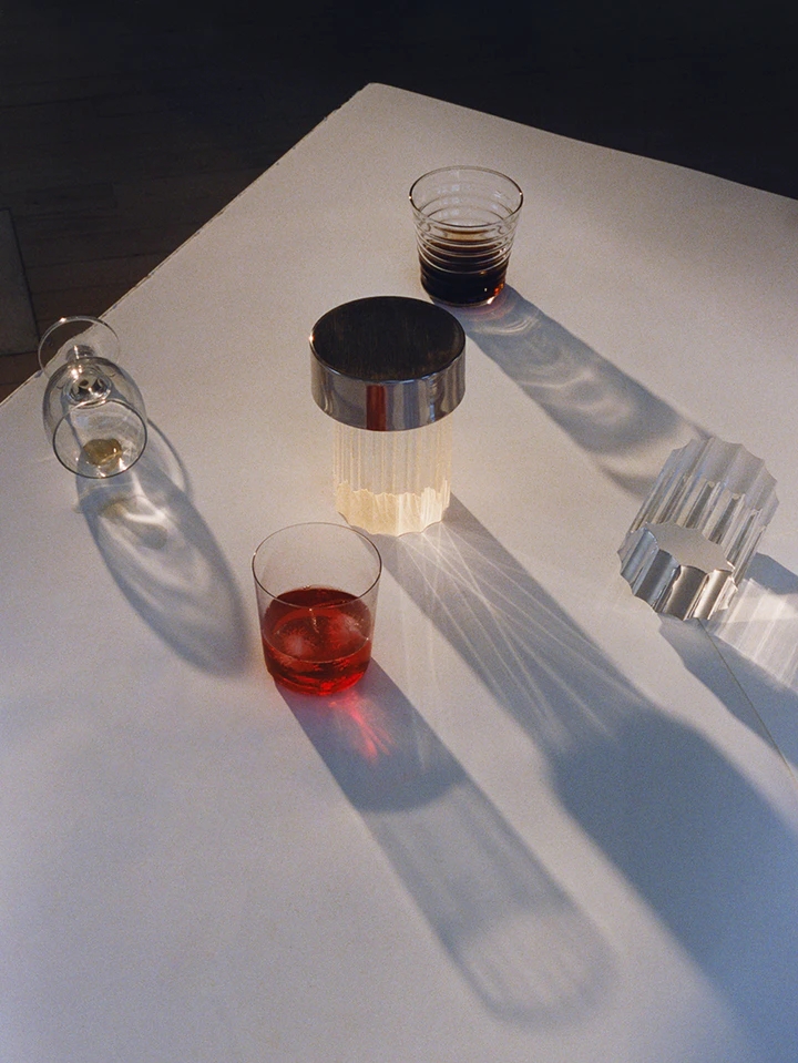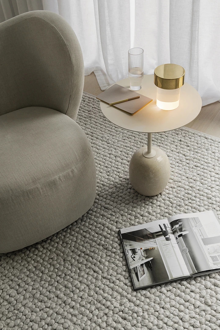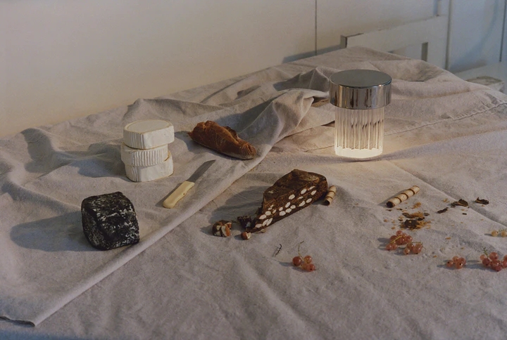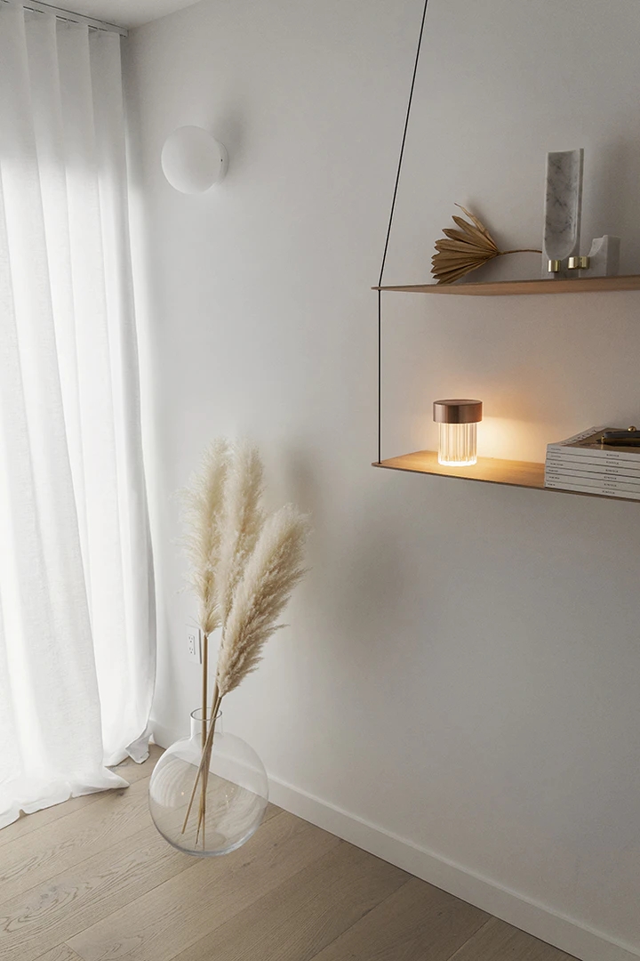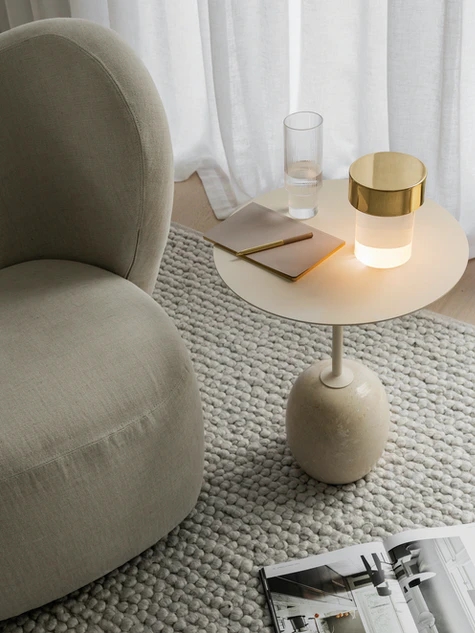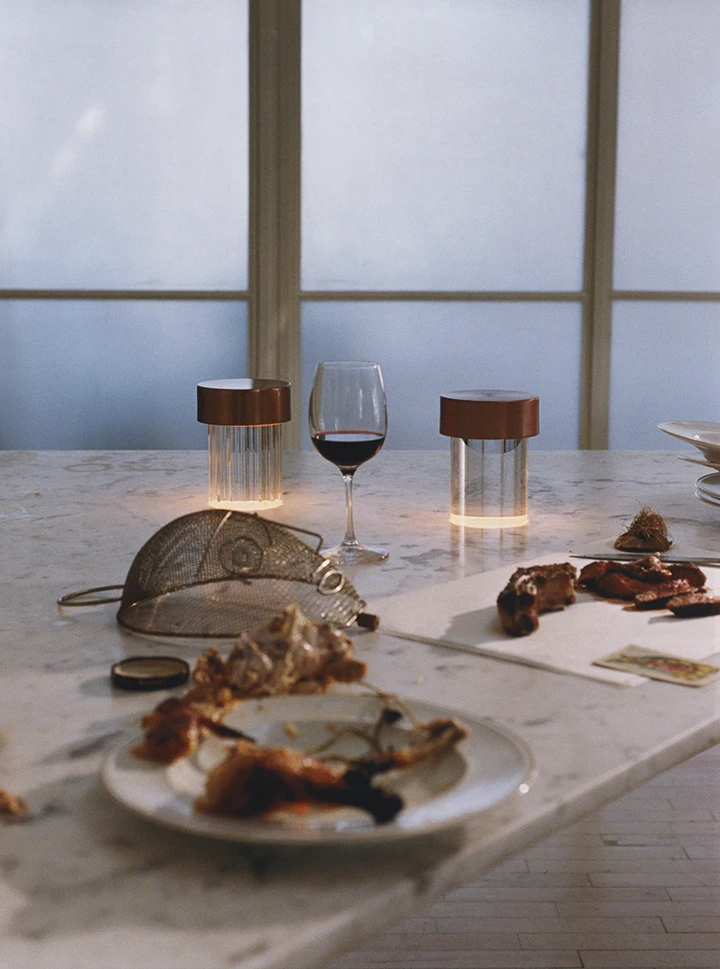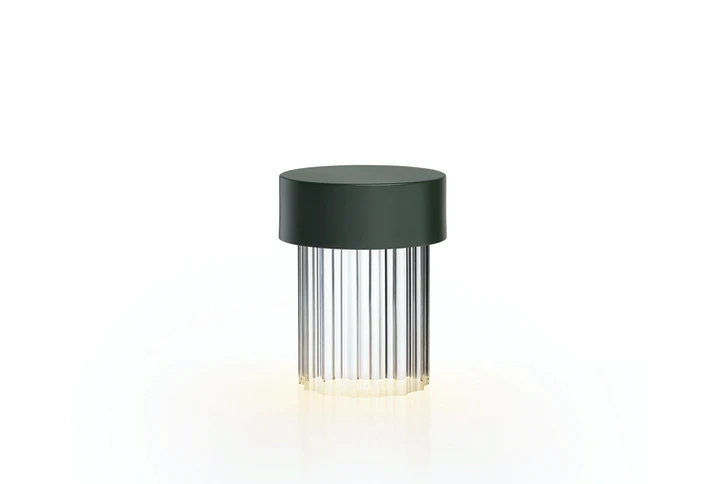 This exquisite portable and rechargeable table lamp diffuses light through an elegant base in solid clear glass. Top cover in four finishes.
