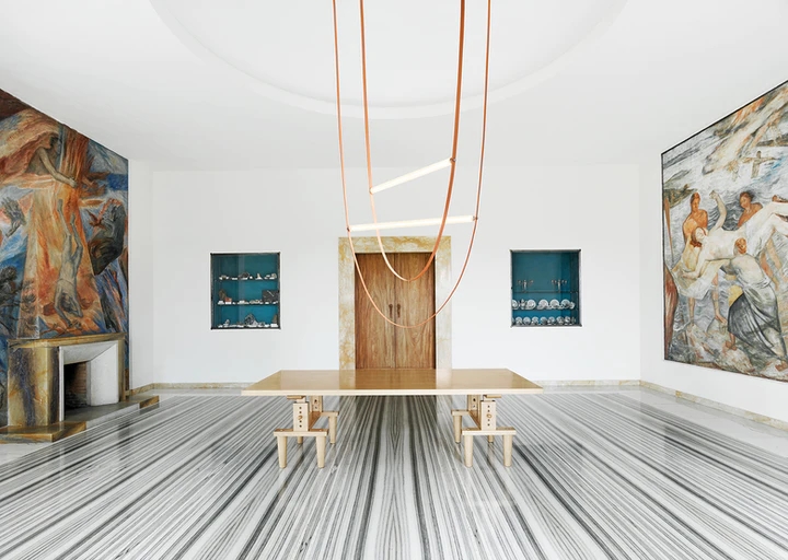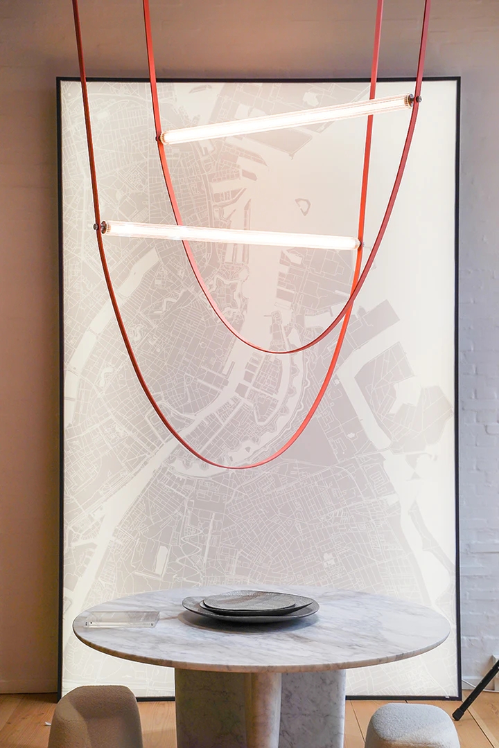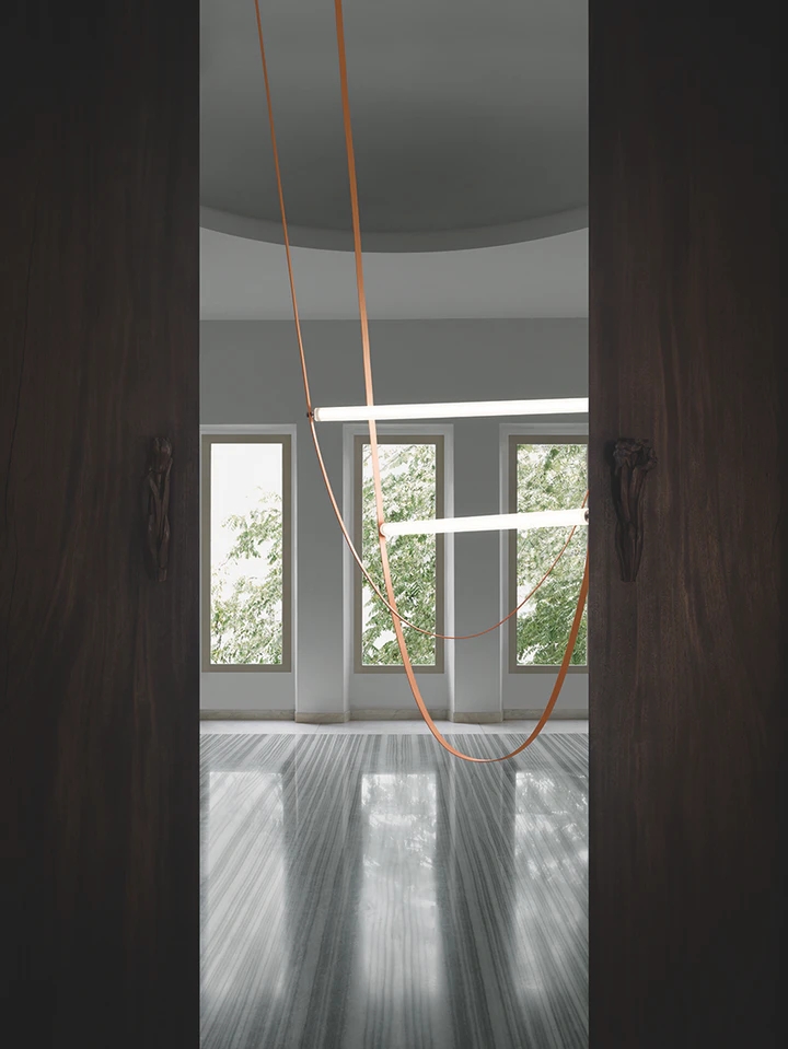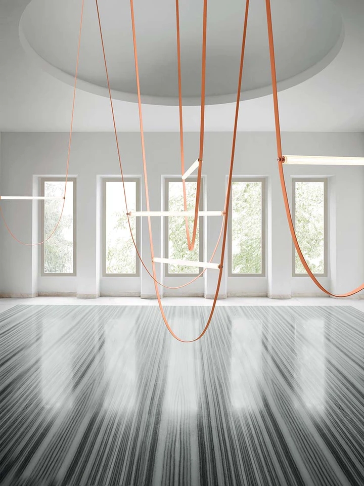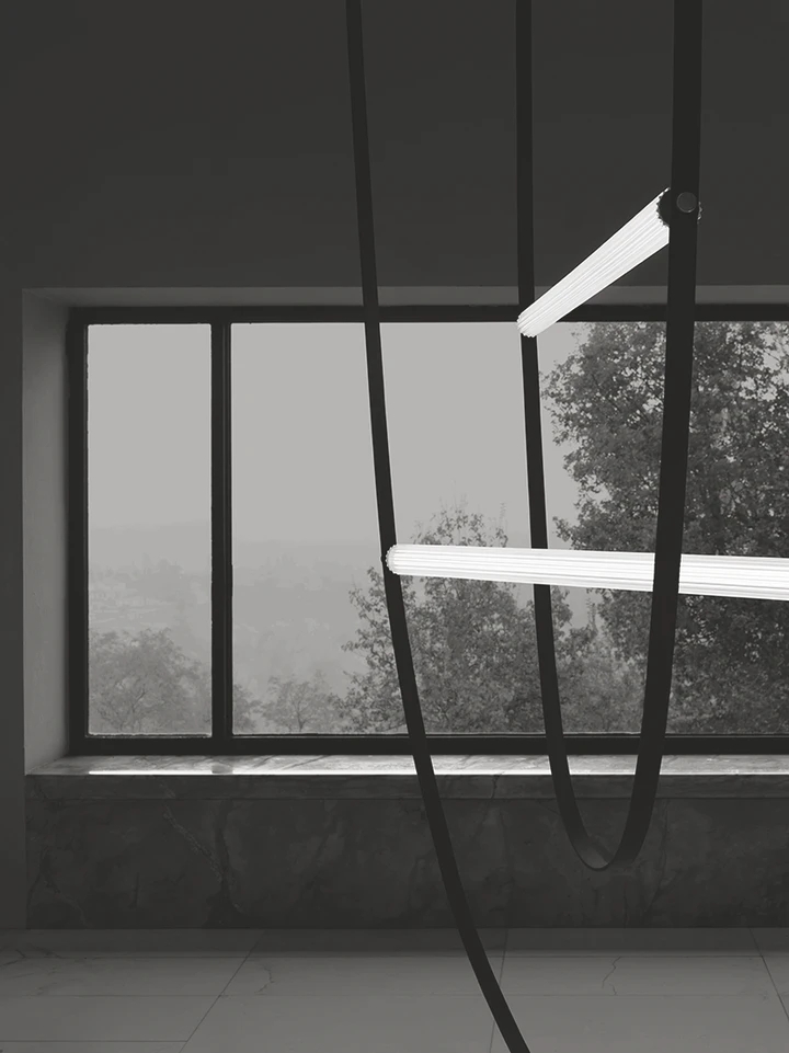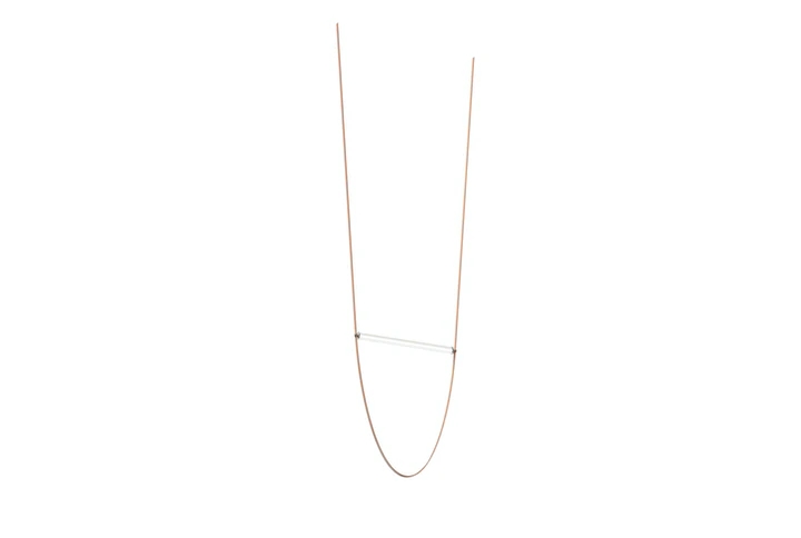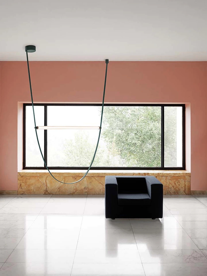 Suspension lamp with diffused light designed using a light source, a powercable, and nothing else.