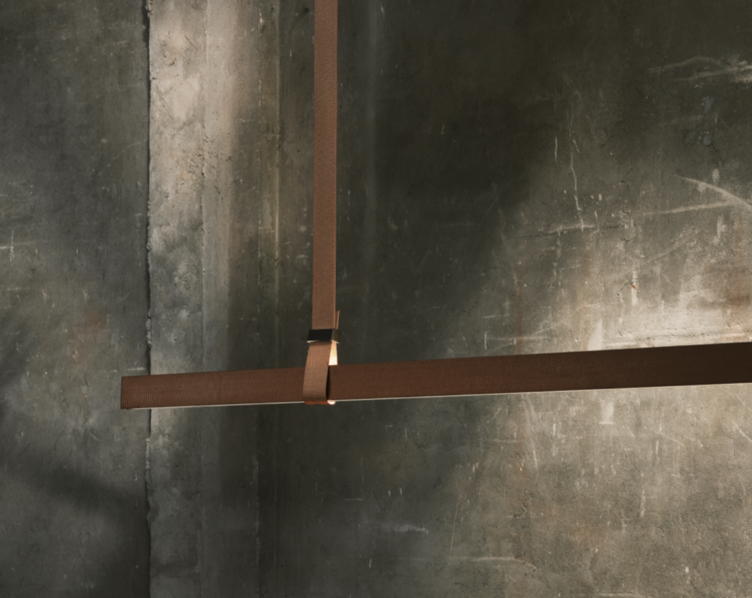 This iconic profile for suspended installation features refined leather or fabric surfaces developed specifically for Flos. Belt is pure flexibility, a sinuous line that creates a balance between the softness of leather or fabric and the rigidity of aluminium. The soft part is represented by the connection to the electrical network, while the rigid parts correspond to the light source, the long lines of light. The fixture is equipped with integrated direct and indirect lighting and each light source can be controlled individually via remote control. The product is installed with the use of leather or fabric straps to hang the lighting profile, sliding the straps through dedicated metal clasps that act as hooks on the ceiling. Each strap may be regulated to match the shape of the environment. A special microconnector integrated into the terminal of the lighting profile allows for electrical connection through a simple snap. The electrical connection is hidden within the leather or fabric straps, which supports the composition. Profiles available in leather (black, natural leather and green finishes) and fabric (grey olive and copper brown finishes). Electrical system powered at 48V dimmable with CASAMBI controller integrated inside the fixture. To manage the system it is necessary to download the FLOS Control? powered by Casambi app (available on Apple Store and Google Play).