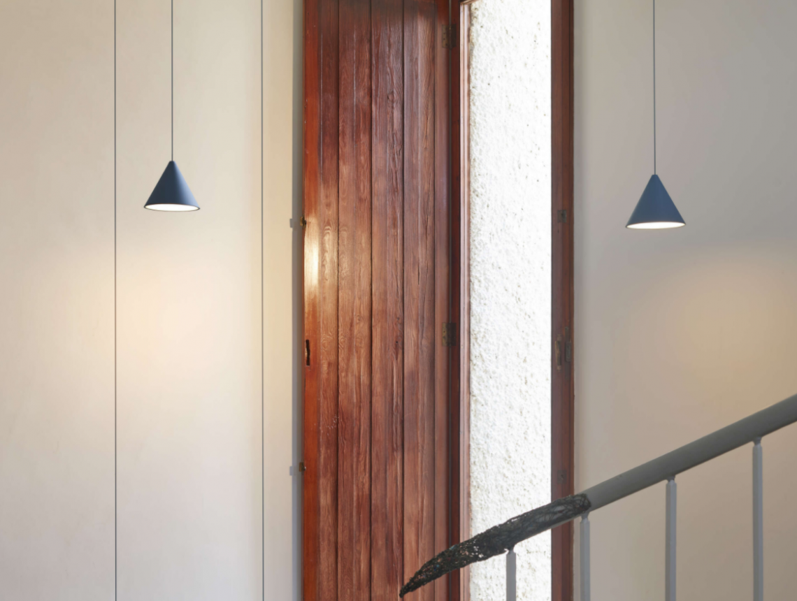 Suspension lamp providing diffused light. Black, white or blue varnished die-cast aluminium body coated with clear soft-touch varnish. Optical diffuser in opal PC. Suspension system of 12 metres with Kevlar reinforced coaxial cable. Available with wall/ceiling connection in black PC and power supply with floor switch in black varnished PC. The on/off switch is electronic with optical and touch dimm mechanism included or touch dimm and CASAMBI Ready version. Dimmer included. Compulsory to add either floor switch or ceiling/wall rose.