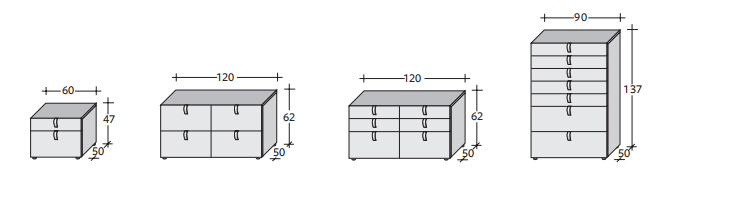 該系列由米色床頭柜和六斗柜組成。它的特點在于把手可選擇兩種顏色:金色和鎳黑色。