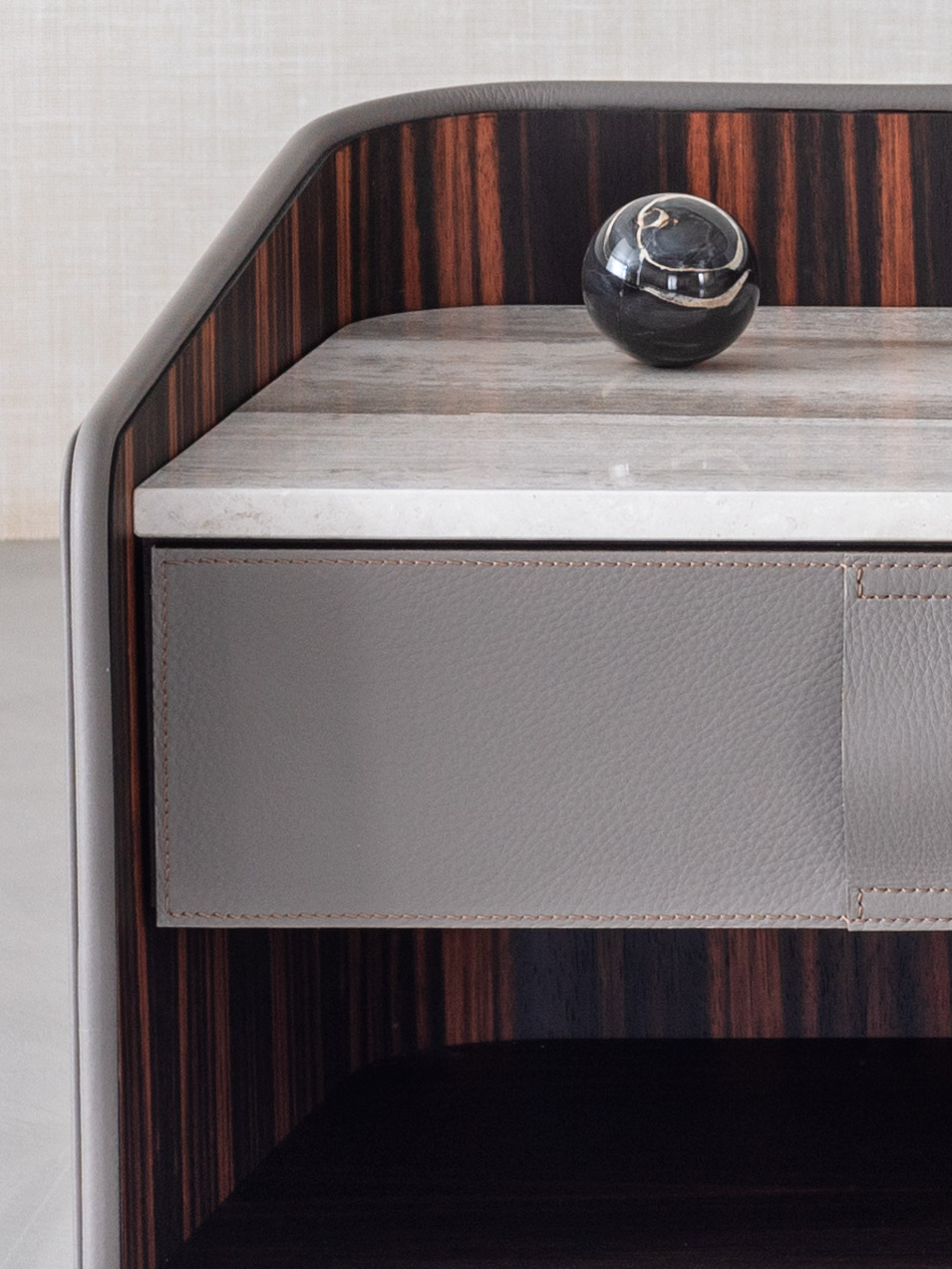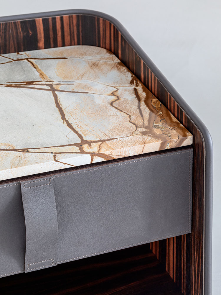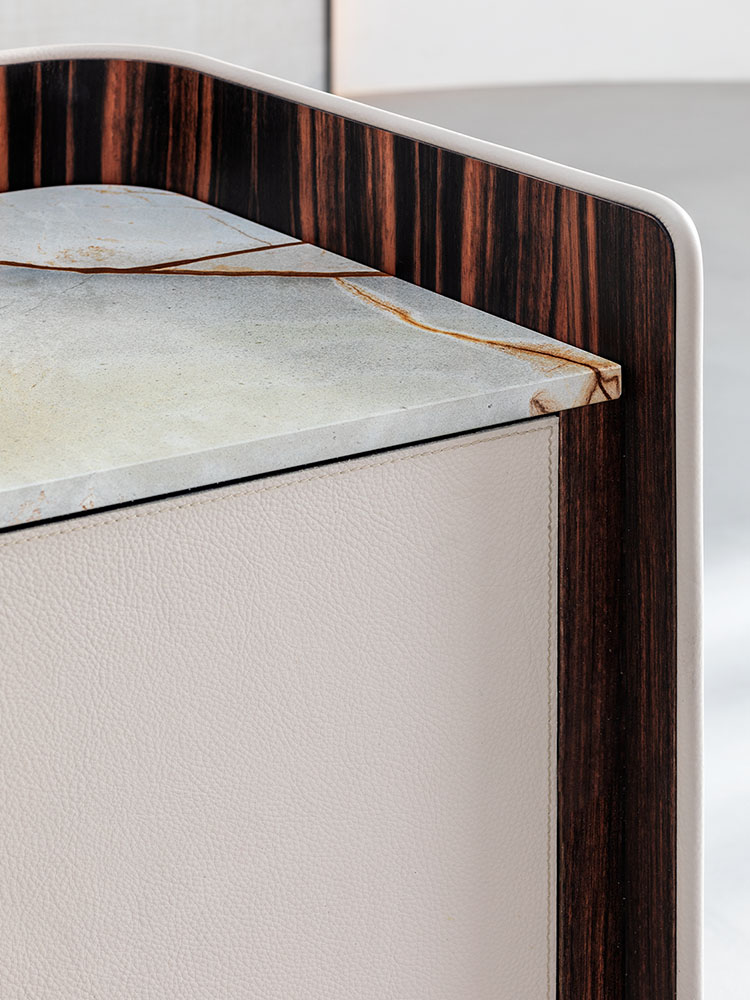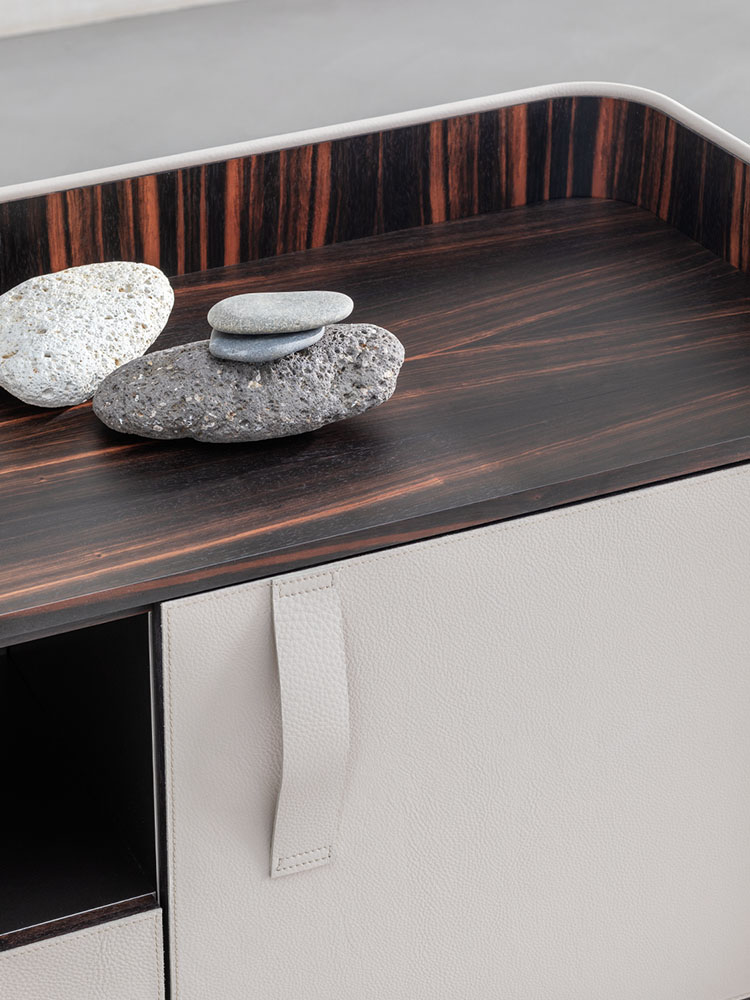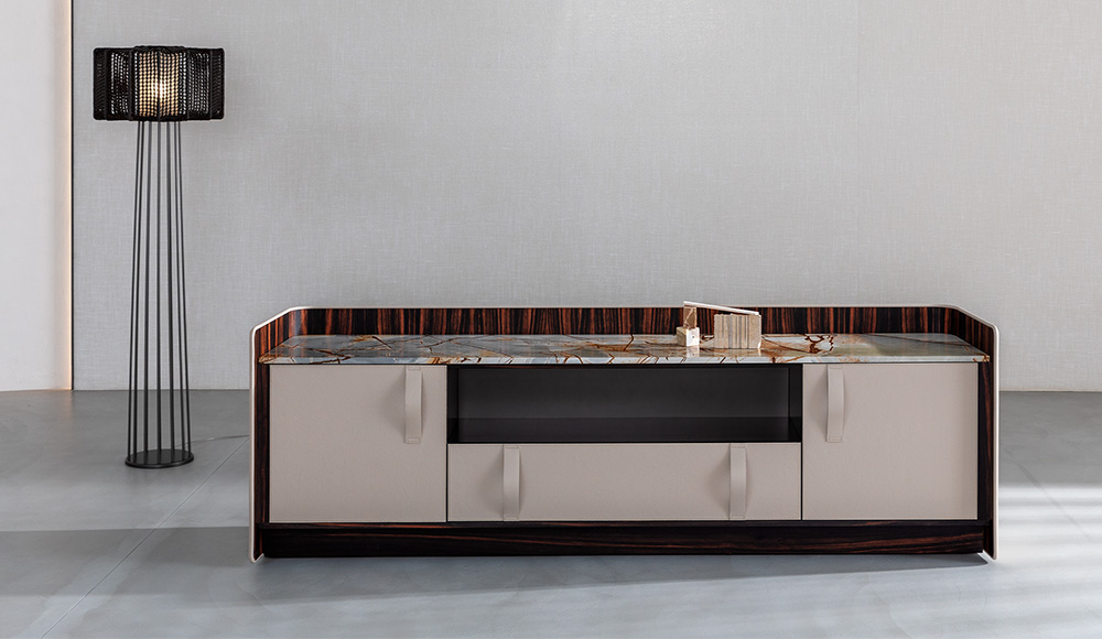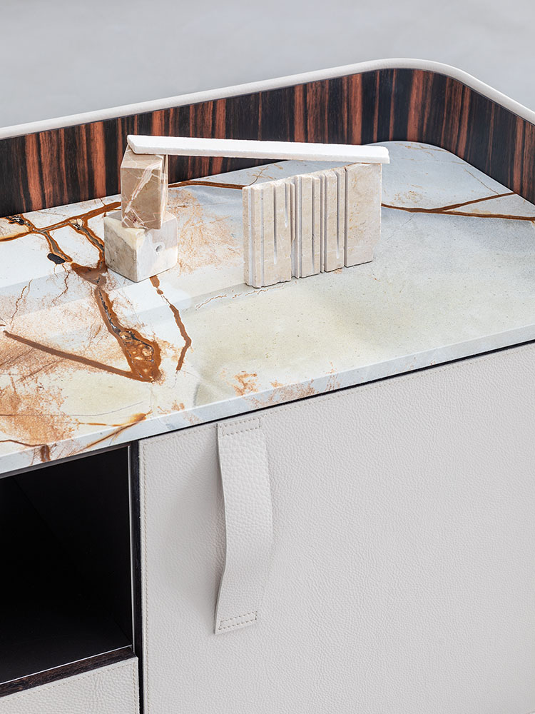 Gentleman餐具柜由兩扇門、抽屜和開放式隔層組成,內部為烏木,外部為新款羅馬帝國大理石。這款大理石精選自巴西,表面有不規(guī)則的紋理,暖色系焦糖色。它是以工匠技藝精心打造的珍貴材料,傾注了我們的熱情、精細和對細節(jié)的極致追求。這也就是為什么Gentleman系列的每件作品都可被譽為“獨件”。