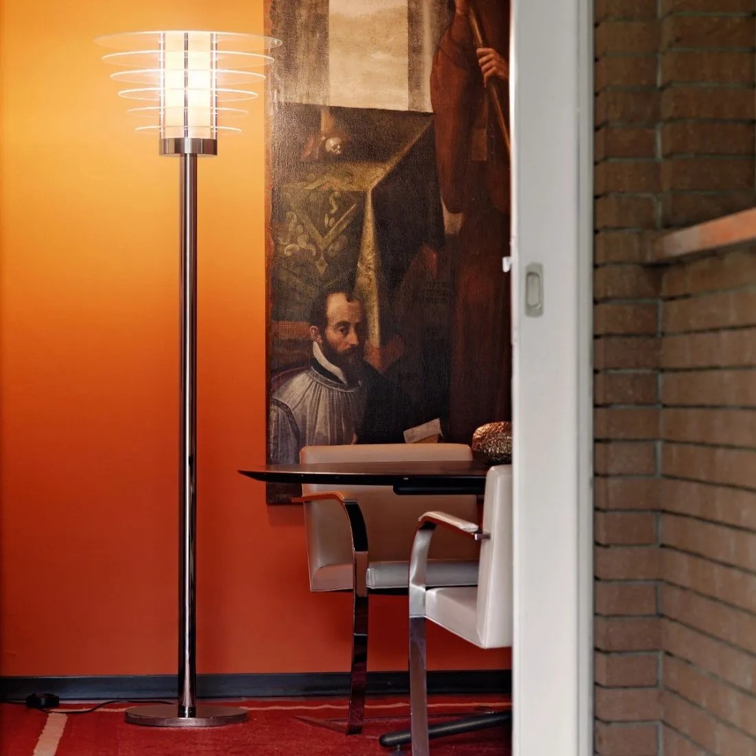 Sequenza di dischi orizzontali in vetro temperato trasparente per un'autentica installazione luminosa. Disponibile da terra e da sospensione, anche in formato XXL, che triplica il diametro della versione classica, fino a raggiungere i 150 cm. Un protagonismo deciso per arredare anche spazi di grandi dimensioni con un’eleganza intramontabile.