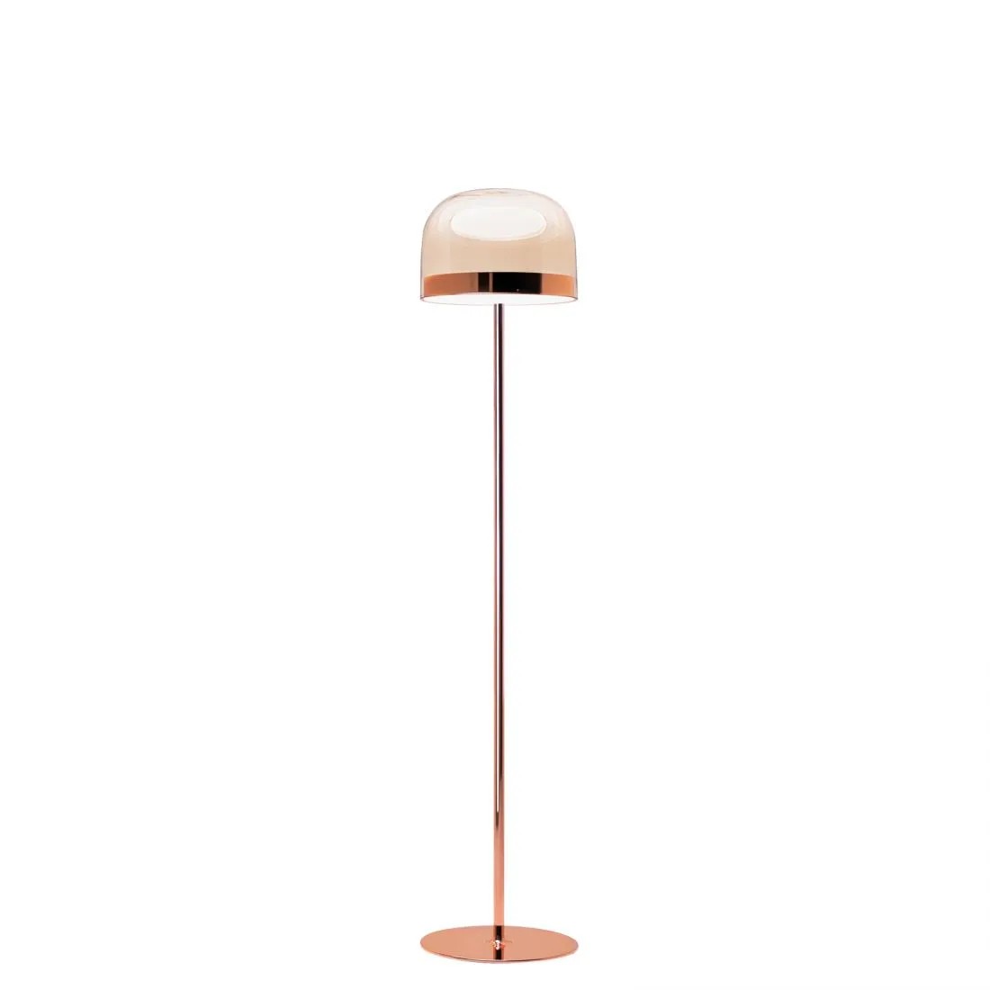 Equatore: reinterpretazione in chiave contemporanea delle classiche lampade con paralume in vetro. Se nelle tradizionali abat-jour il diffusore alloggia al suo interno la sorgente luminosa, in questa famiglia di lampade il diffusore è paradossalmente e suggestivamente vuoto e l’effetto luminoso è prodotto da due dischi luminosi all’interno di una fascia metallica centrale, visibile sul paralume e che richiama la linea dell’equatore. La luce prodotta dai Led, grazie a schermi interni disposti a strati, si distribuisce regolarmente sulla superficie dei dischi, irradiandoli magicamente di luce. Il disco inferiore produce un’emissione luminosa verso il basso, quello superiore illumina la calotta di vetro, per una diffusione morbida della luce. Disponibile da tavolo, da terra e da sospensione, in due misure, si declina in due tonalità: una più fredda, in grigio con struttura cromo scuro, e una più calda, con calotta trasparente tortora e struttura color rame.