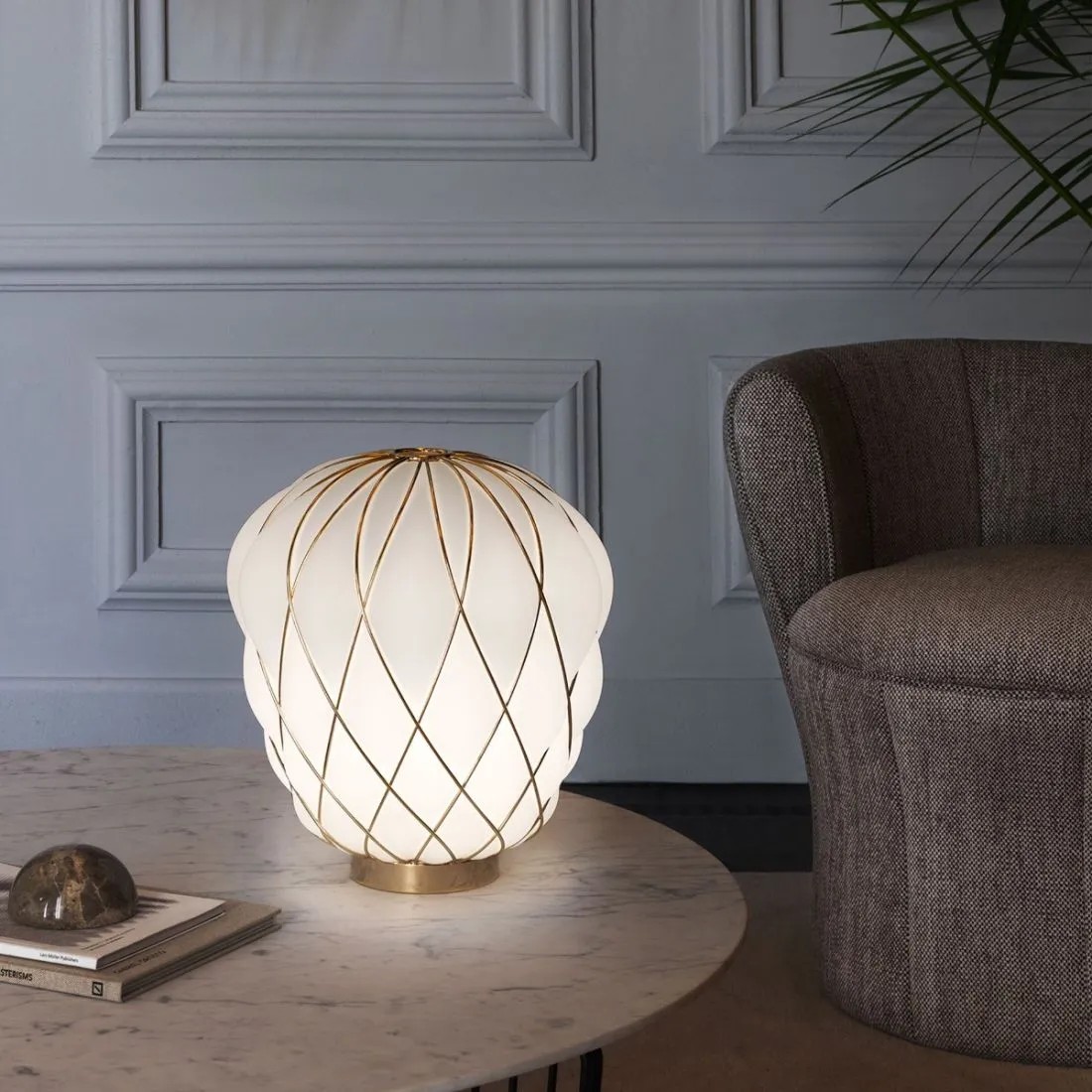 In questo modo il manufatto finale viene in parte trattenuto dalla gabbia e in parte vi sfugge, creando un gioco di tensione che genera un oggetto sospeso nell’atto di fuoriuscire dal proprio vincolo; la gabbia viene ulteriormente impreziosita da un trattamento galvanico che ne esalta l’aspetto rendendola lucida e brillante. La versione trasparente, in particolare, permette all’osservatore di leggere un doppio livello di struttura, moltiplicando l’effetto scenografico, e l’intreccio del cesto metallico proietta sulle superfici circostanti un caleidoscopico gioco d’ombre. Al contrario, la versione bianca segue delicatamente la gabbia e ne sottolinea le geometrie generando una luce diffusa elegante e piacevole.