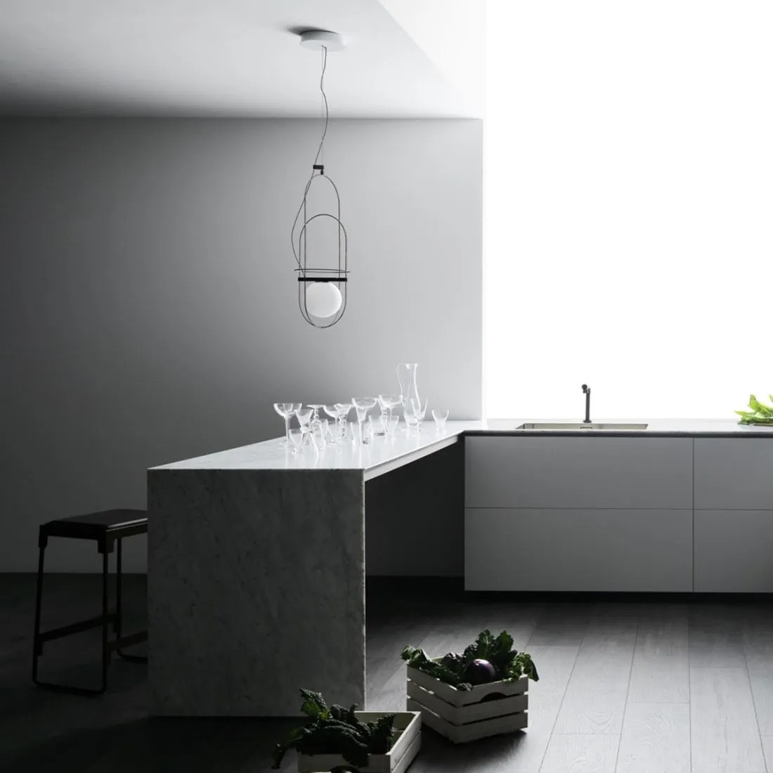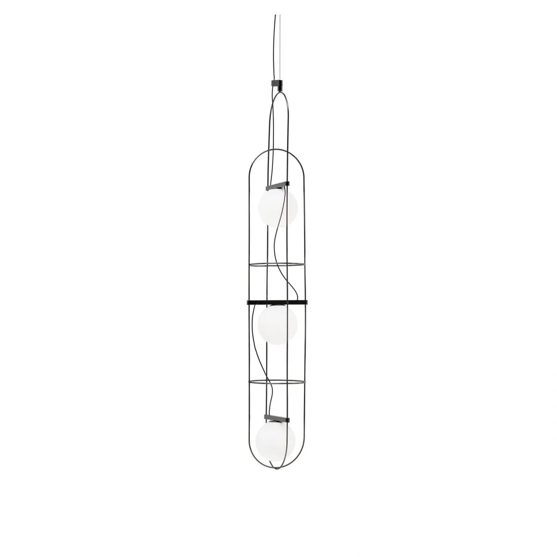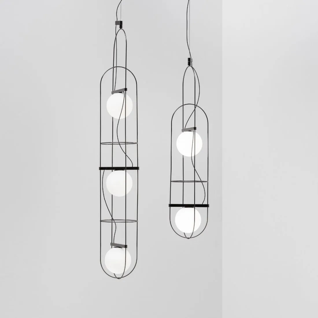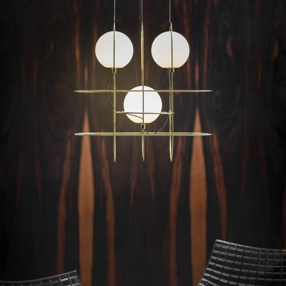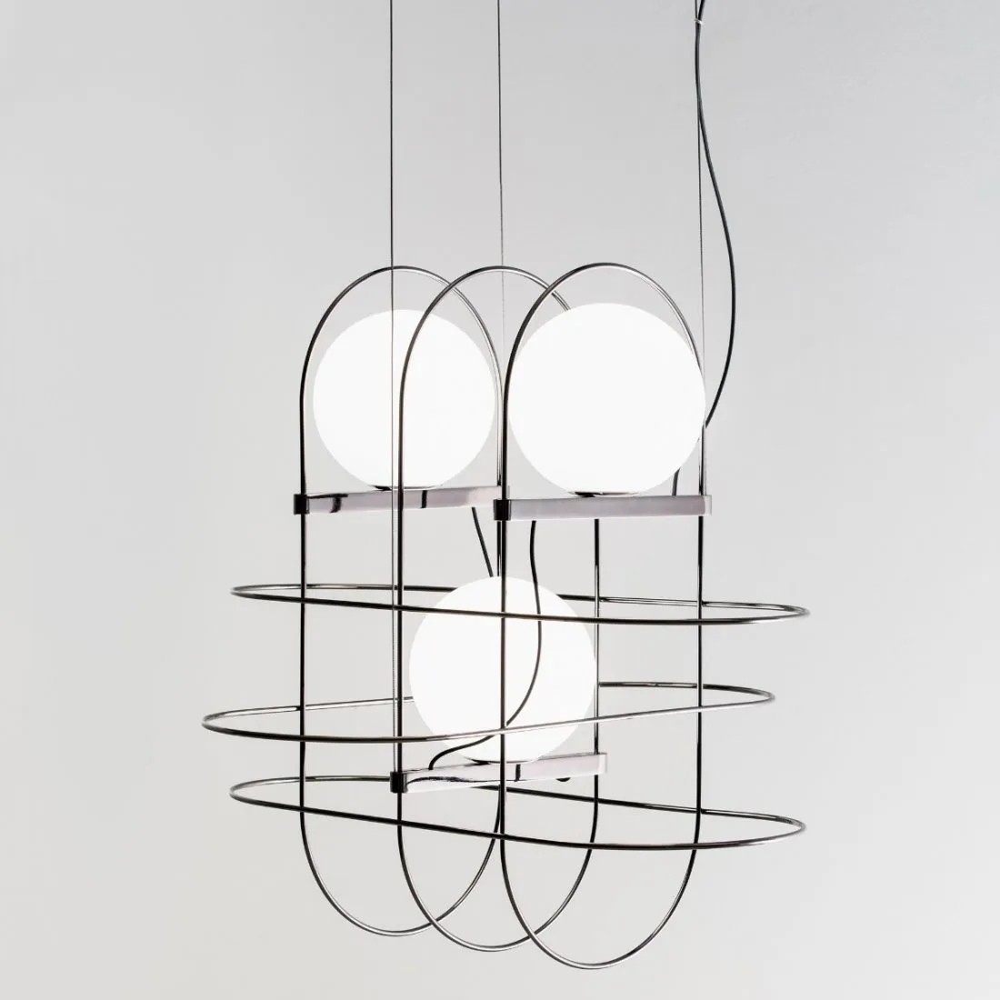 Setareh nasce dal tema di dare corpo alla luce. La lampada è composta da una sfera magicamente sospesa all’interno di una struttura metallica sottile. Un gioco di masse e di traiettorie circolari genera un disegno bilanciato di dinamiche gravitazionali. La luce emanata dalla sfera si diffonde sullo spazio circostante e irraggia il telaio. I riflessi del metallo rendono visibile il campo luminoso, lo spazio influenzato dalla luce, la sua aura. Il risultato è una collezione di apparecchi luminosi, declinata nella versione da tavolo e sospensione, di straordinaria grazia poetica. Setareh assume una nuova dimensione: allungata con due e tre sfere luminose, per lavorare sia singolarmente sia per moltiplicazione.