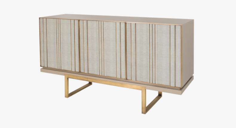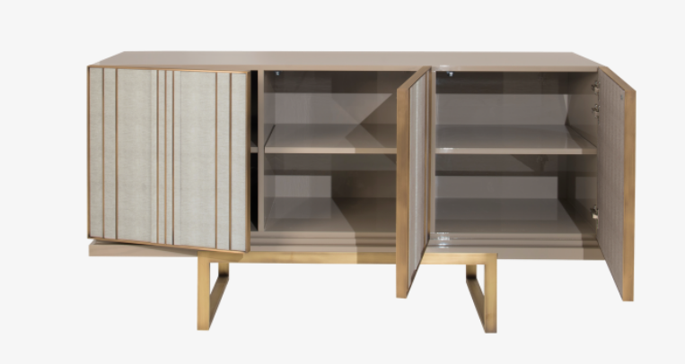 Part of a three-piece storage collection, the alluring ASCOT sideboard features a box of glossy lacquered wood and a metallic base. Three doors inlaid with leather and featuring irregular brass stripes add an unexpected rhythm to the design