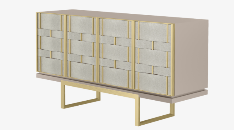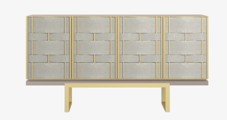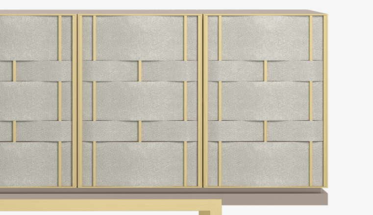 An intriguing design piece that will instantly transform your space, the sleek, angular form of the four-door CAPRICE sideboard is elevated with an artisanal frontage, where strips of grey leather are woven under and over verticals of brushed brass.