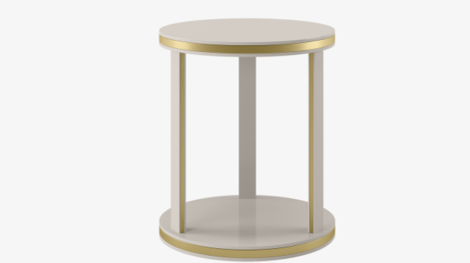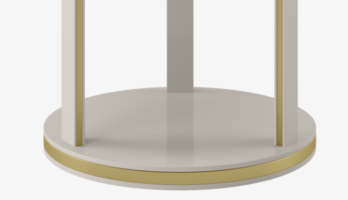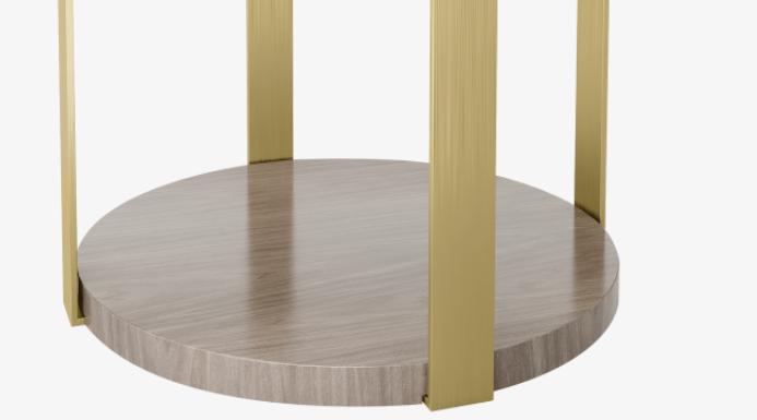 Consisting of two circles of glossy wood veneer supported by four strips of brushed brass, the BENIM side table is at once simple and striking. Place everyday items on top, and less frequently used items below