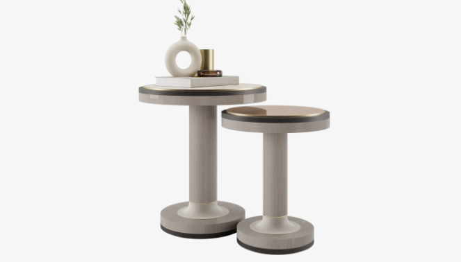The simple, chunky pedestal form of the CALGARY side table focuses the attention on the beauty of the expertly layered materials, which include stone, brushed brass and contrasting shades of wood veneer. Place alongside a sofa or use as a pared-back bedside companion.