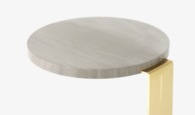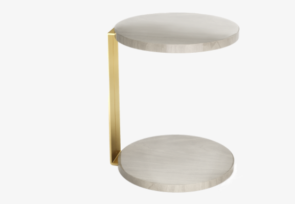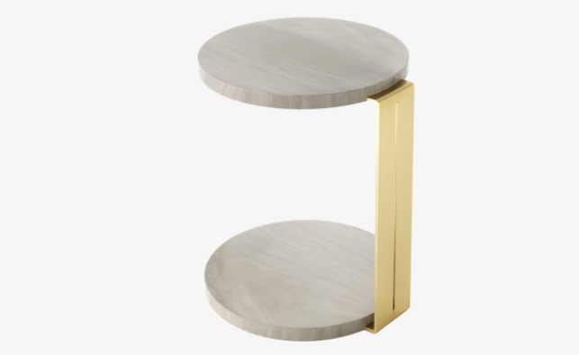 Consisting of two circles of glossy wood veneer supported by a bracket of brushed brass, the HO CHI MINH Side Table utilises a clever cantilevered design – this creates two open and accessible surface areas that can be used for storage or display.