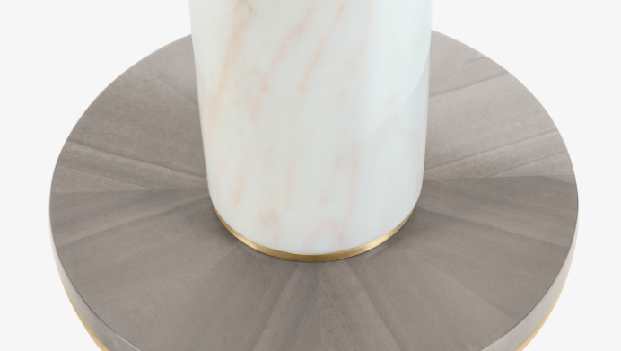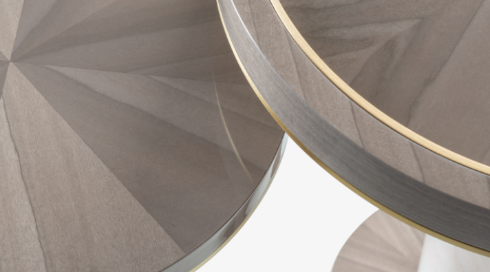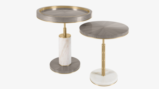 The SEATTLE features a pair of elegant side tables that stand at different heights, allowing them to neatly and chicly slot together. Presenting two different but equally sculptural silhouettes, they’re crafted from glossy veneer, brushed brass and stone.