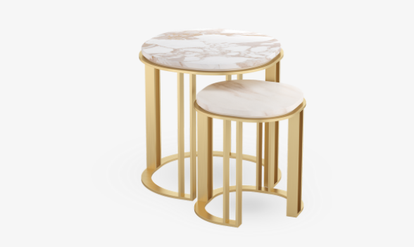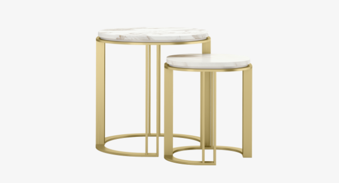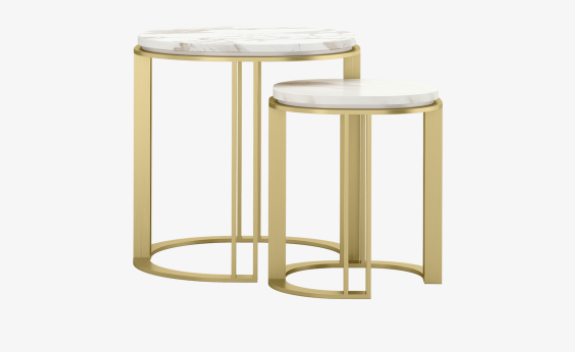 An incomplete circular base adds verve to the idiosyncratic TARTU side table, allowing the two sculptural volumes to nestle easily together. Consisting of a metal base and stone top, this iteration of the design showcases the timeless appeal of white marble on brushed brass.