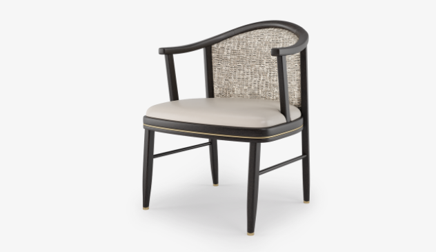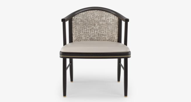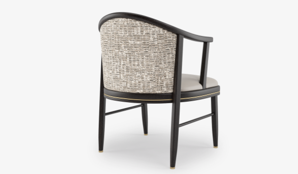 The first thing you notice about the stunning FUJI dining armchair is its free-flowing silhouette, which is dramatically outlined in dark solid wood. This flawlessly frames subtly different upholstery fabrics while accents of slimline brushed brass complete the look.