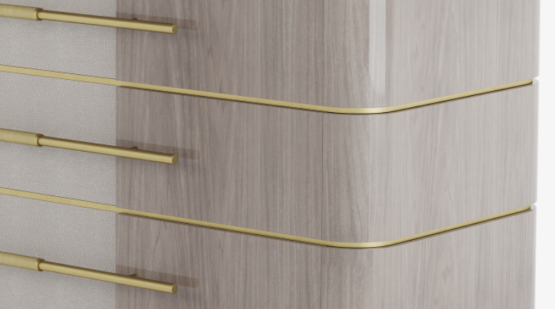 Crafted from wood veneer, the AGRA Chest of Drawers tempers its solid-looking silhouette with brushed-brass accents, elongated handles and panels of tactile leather. Ensuring a superior finish, it’s six drawers are internally lined with super-soft suede.