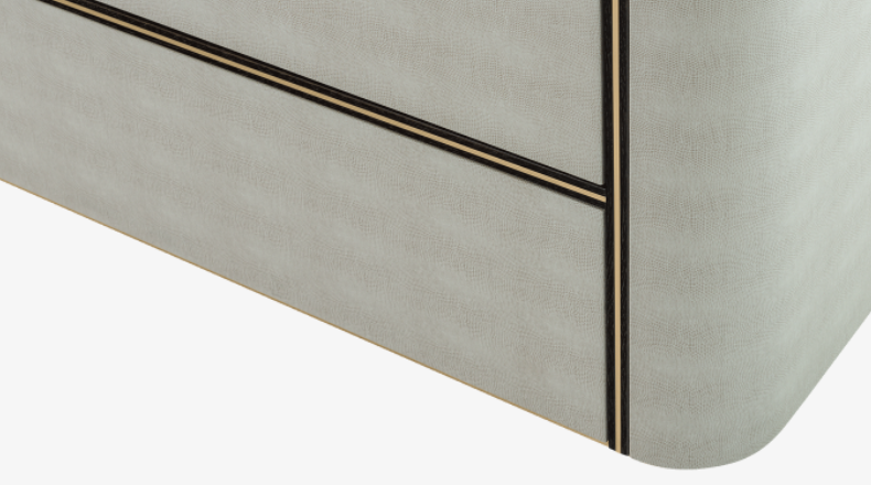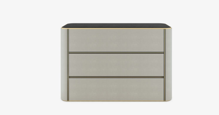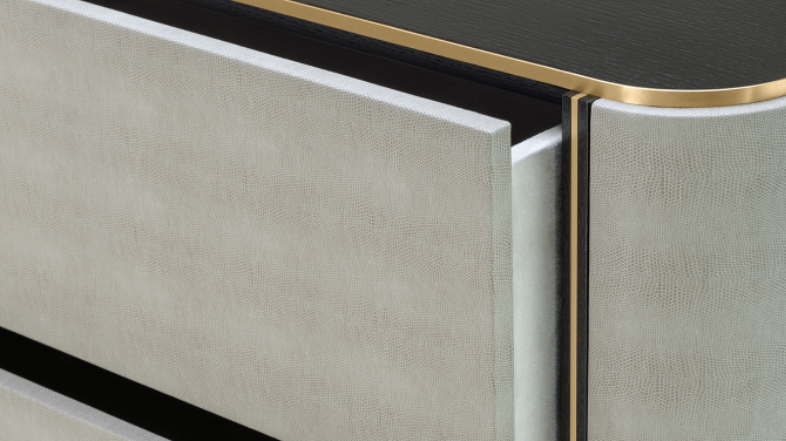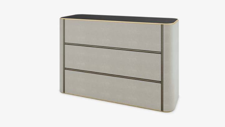 A closer look at the well-appointed KENT Chest of Drawers reveals a facade finished in luxe leather. A softly curved design, it incorporates three, handle-free drawers that are outlined in a combination of brushed brass and dark wood veneer that matches the surface.