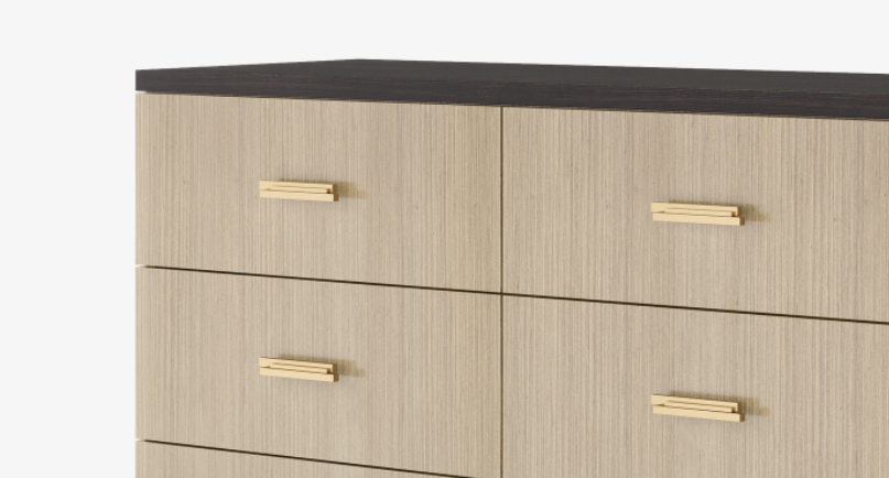 The chic LAGOA Chest of Drawers incorporates six generous drawers, each lined in soft suede and embellished with distinctive brushed-brass handles. Fashioned from wood veneer, a darker tone across the base and the surface adds contour to the design.