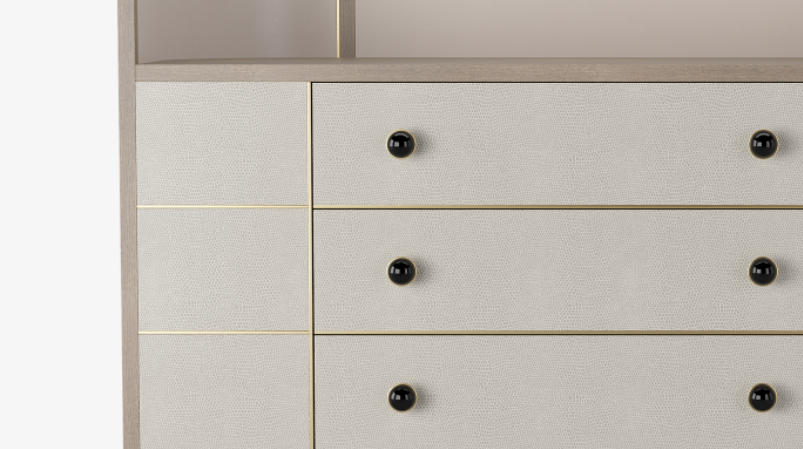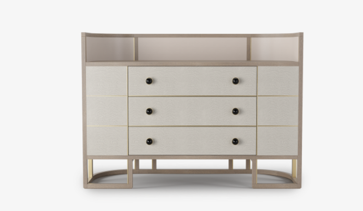 Making organisation glamorous, the PARMA chest of drawers feature an elegantly curved shape. Richly textured leather inlays give it chic appeal. It pairs perfectly with other pieces from the PARMA collection.