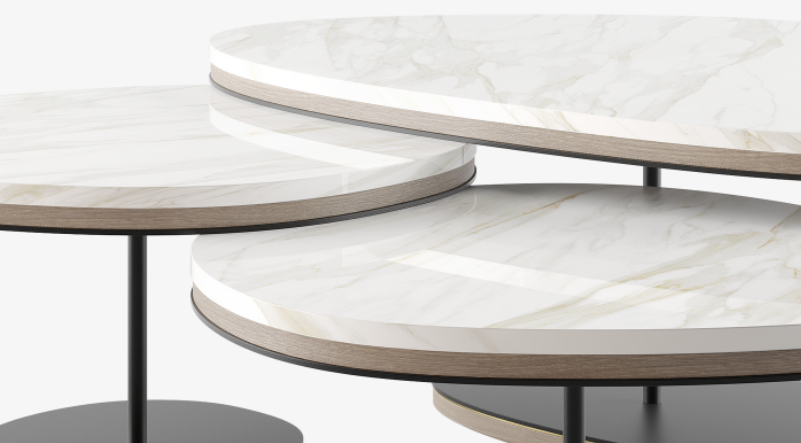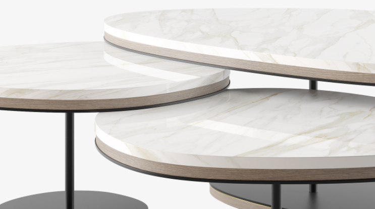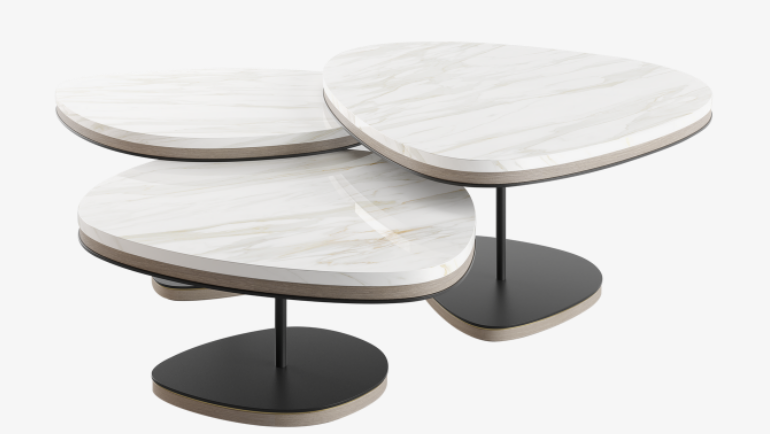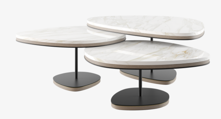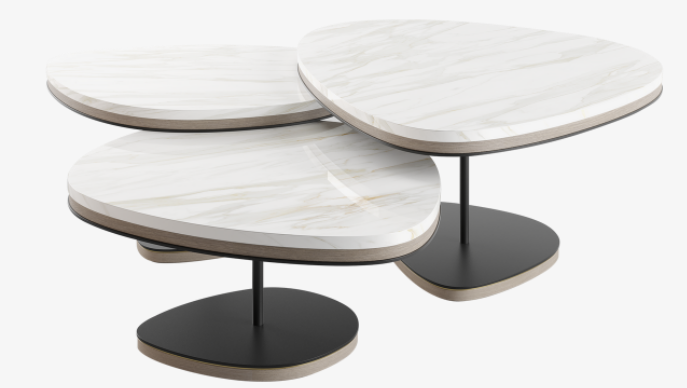 Reminiscent of a cascade of pebbles, the graceful ANTWERP introduces a more natural, organic shape to our collection of coffee tables. A trio of overlapping volumes, the design fuses lustrous white stone, wood veneer and painted iron with elements of brushed brass.