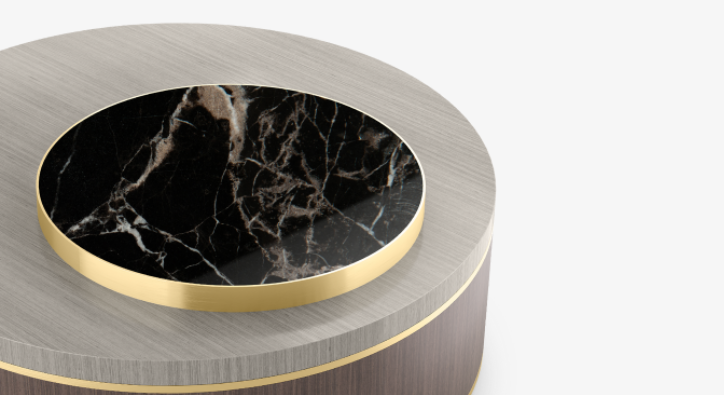 A symphony of circles and materials, the exquisite ATLANTA coffee table artfully layers metal and wood veneers. On the surface, a stone rotating tray with metallic trim is placed off-centre for a quirky and practical finishing touch.