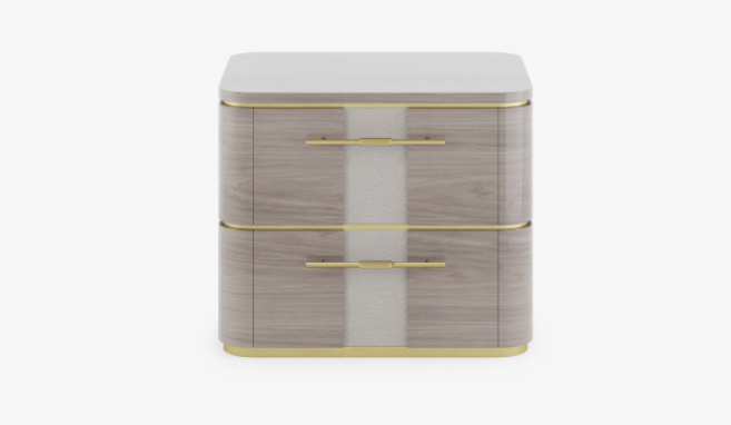 A softly edged cube shape, the AGRA bedside table integrates a surprising rich material mix into its well-ordered design. Predominantly Crafted from glossy wood veneer, it accessorises with a stone surface, brushed and knurled metal handles and leather insets on its two suede-lined drawers.