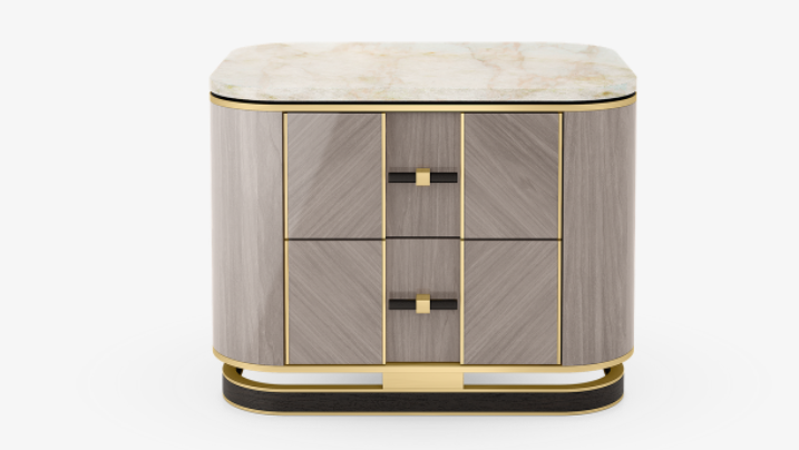 The ASHI Bedside Table is brimming with character. A curved cube crafted from wood veneer, its two suede-lined drawers are opened with sculptural handles of solid wood and brushed brass. Further details include a framework base and stone surface that’s cool to the touch.