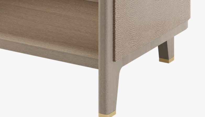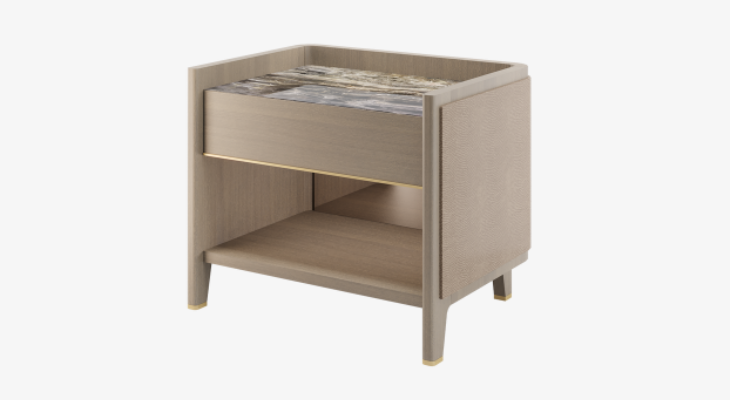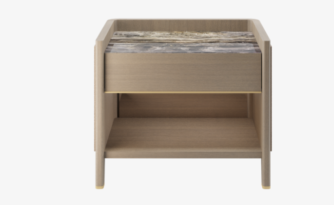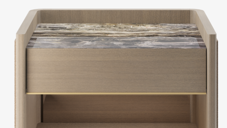 A smooth stone surface, wraparound leather panel and reflective bronze mirror interior add unexpected layers to the HVAR bedside table's minimalist lines.