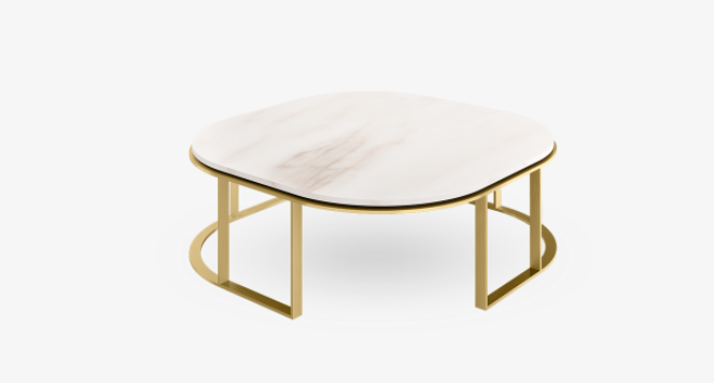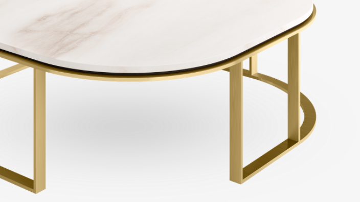 The stone top of the TARTU Coffee Table is layered over a slice of recessed lacquered wood, which creates an idiosyncratic section of shadow between the design’s surface and brushed-brass framework, which appears perfectly symmetrical or quirkily offset depending on the viewing angle.
