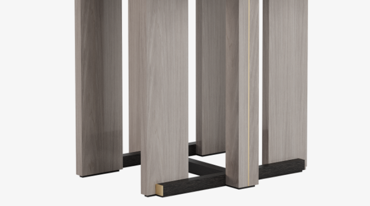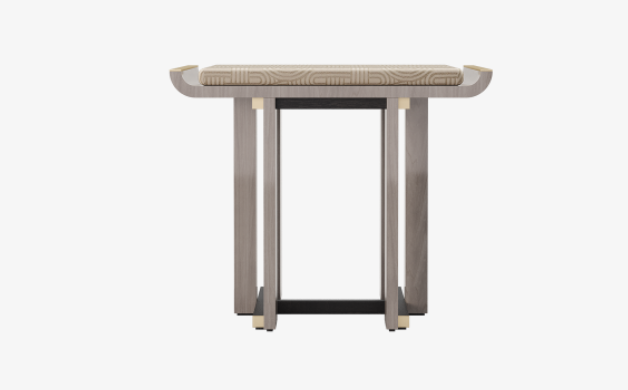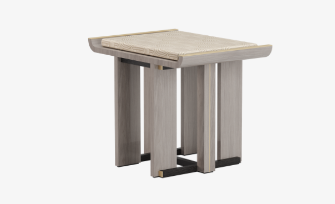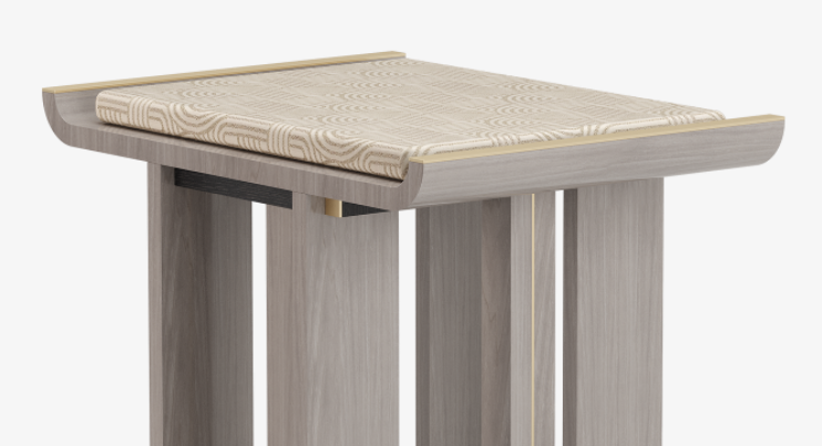 Seamlessly crafted from delicately veined, mid-toned wood veneer, the graceful GINZA stool uses ornamental elements of brushed brass to emphasise its archetypal silhouette. "