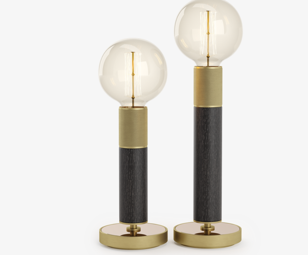 Available in two different sizes, the shade-free ASPEN takes the concept of a table lamp back to basics. Showcasing an incandescent bulb, the core of the design is made from knurled and brushed brass, wood veneer and a base inlay of bronze mirror.