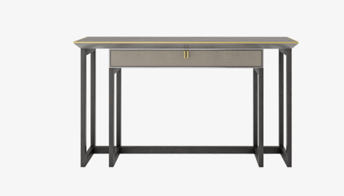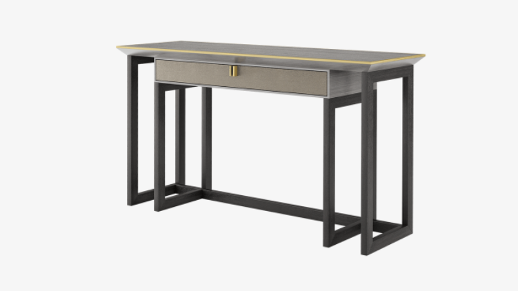 An avant-garde take on a design within a design, the innovative BALI console incorporates a wood veneer box drawer with leather front and suede interior, a wood veneer surface, brushed brass handles and seams, plus a solid wood framework.