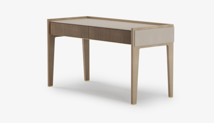 "The gorgeous HVAR desk celebrates the beauty of craftsmanship with artisanal details that feel quietly luxurious, such as the fluted wood veneer that fronts the design’s single, handle-free drawer. "