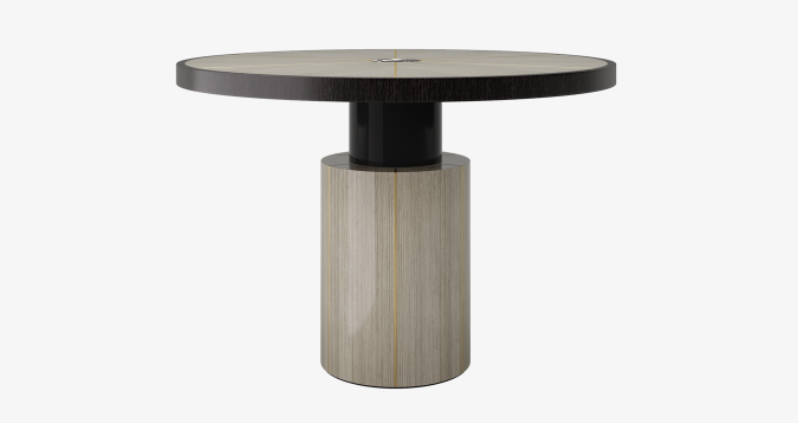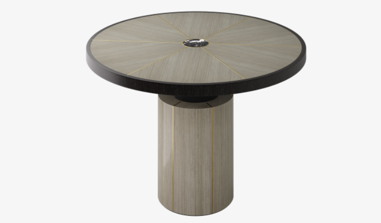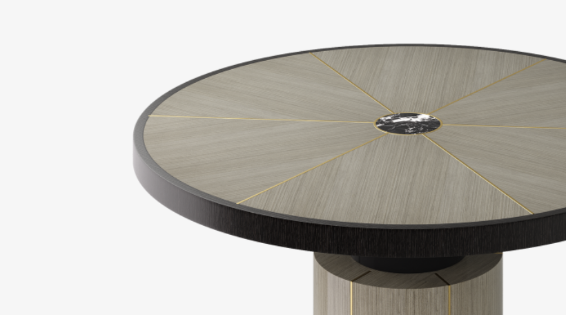 "A substantial pedestal and fuss-free form infuses the RAIPUR with a more masculine energy. Featuring a circular, wheel-like tabletop crafted from wood veneer, a centre of stone and spokes of brushed brass subtly elevate the whole. "
