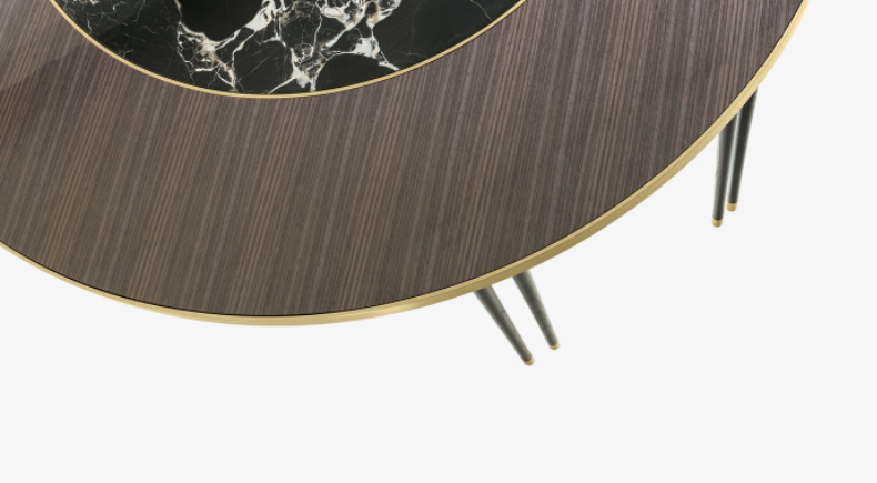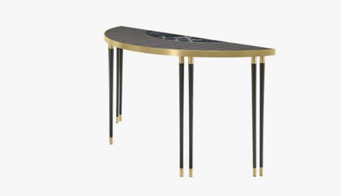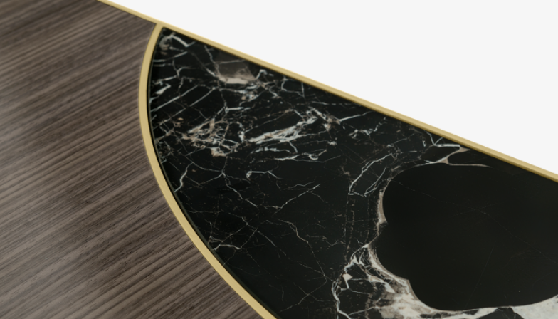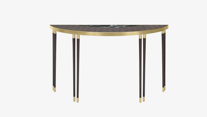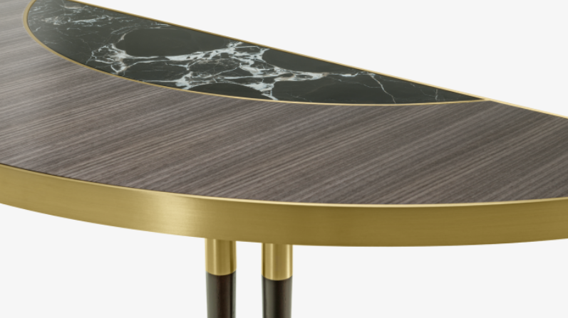 A smooth crescent shape, the curved RICHMOND console will add a sense of flow to your space. Full of unique details, its signature surface features a cross-section of stone, brass and veneer, and rests on eight slimline legs hewn from solid wood and capped with brass.