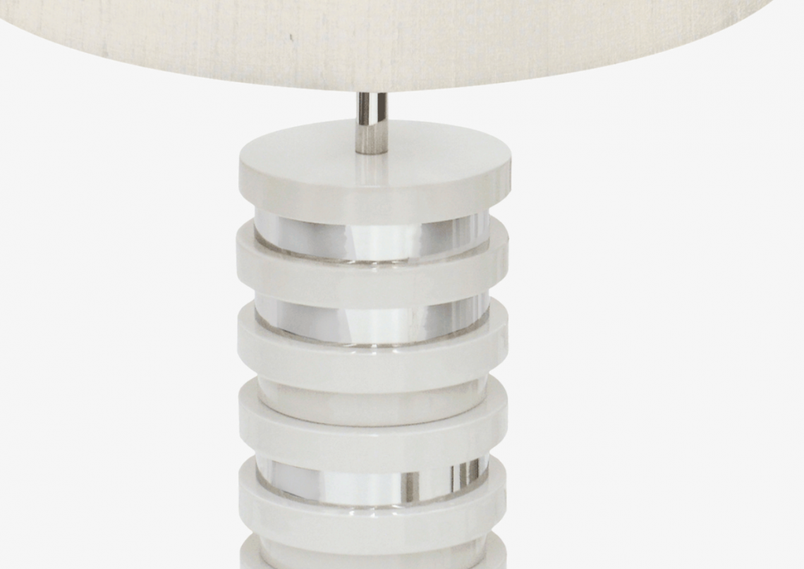 Designed to standout, the opulent VENEZA table lamp features alternating sections of white lacquered wood and light-reflecting polished stainless-steel. Topping off the design is a conical shade woven from double silk.