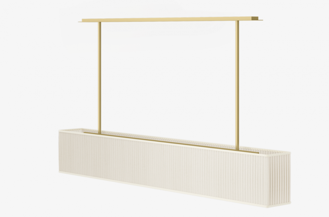 :A single, pleated-silk shade measuring 200 centimetres distinguishes the design of the clean-lined NIMES ceiling lamp. This is suspended from two elegant pole that hang from a slender rectangular base plate.