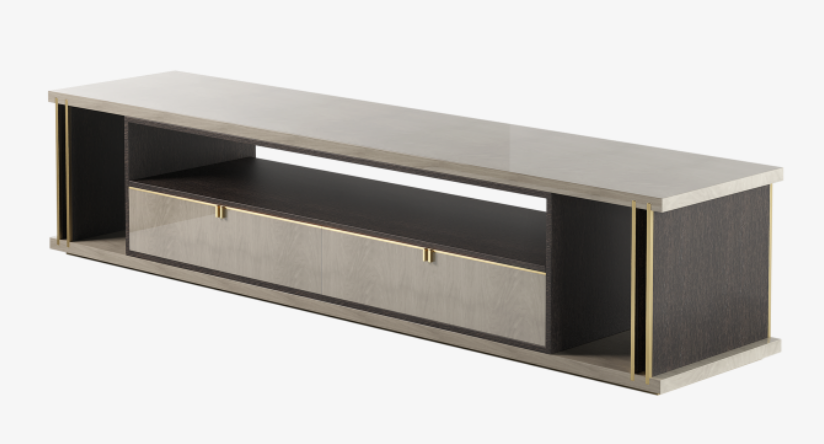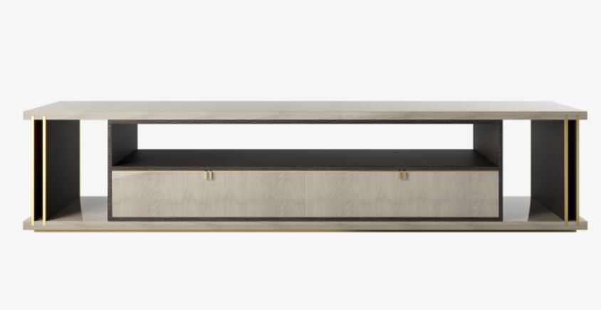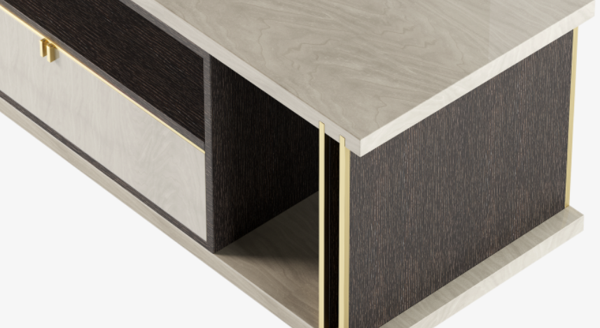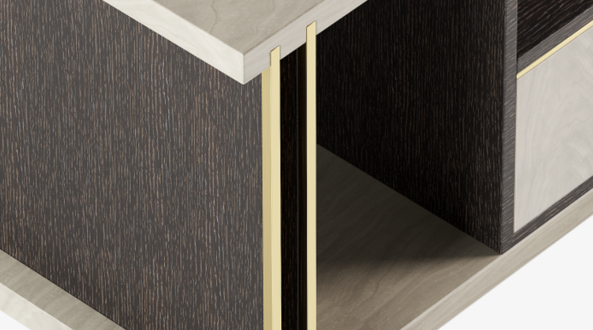 The sculptural DHAKA TV unit plays with different shades of wood veneer, contrasting the beauty of this natural material with the polish of brushed brass. Providing generous storage, the design incorporates double drawers and a mix of open shelves.
